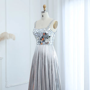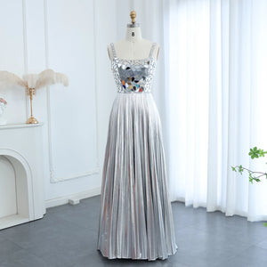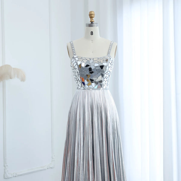 Este vestido longo deslumbrante é a escolha perfeita para eventos formais, casamentos e festas de gala, combinando elegância clássica com um toque de glamour moderno. Feito em cetim de alta qualidade, o vestido apresenta um design geométrico fascinante, com brilho delicado e detalhes de diamantes que capturam a luz de maneira encantadora. A silhueta A-line proporciona um caimento fluido e elegante, enquanto o decote quadrado adiciona um charme sofisticado. A cauda varrendo o chão e os detalhes de cristais, contas e paetês conferem um toque de luxo ao modelo.