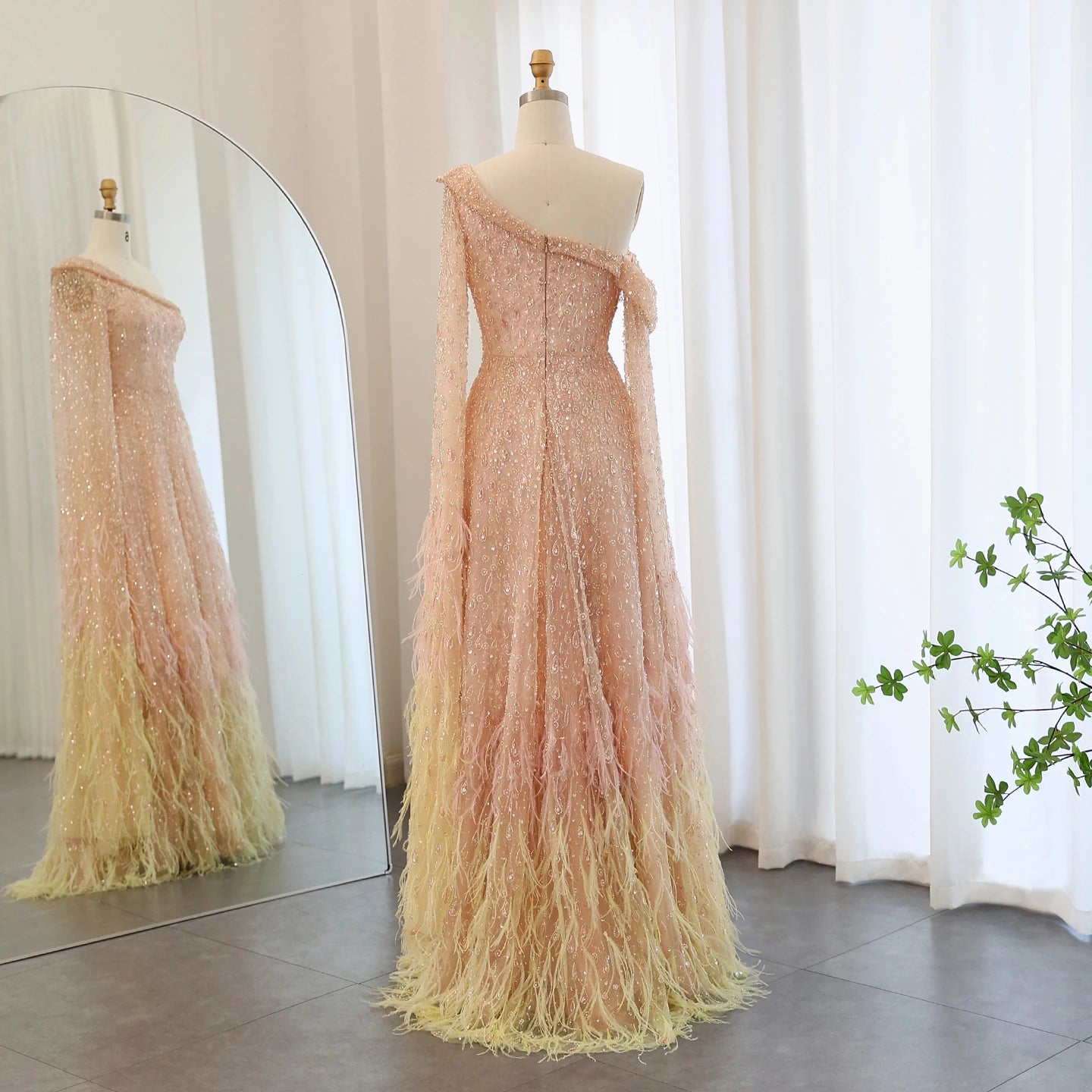 O Vestido de Festa com Renda e Plumas Adornado com Brilho - Modelo Especial é uma verdadeira obra de arte da moda, projetado para deslumbrar em qualquer evento especial.