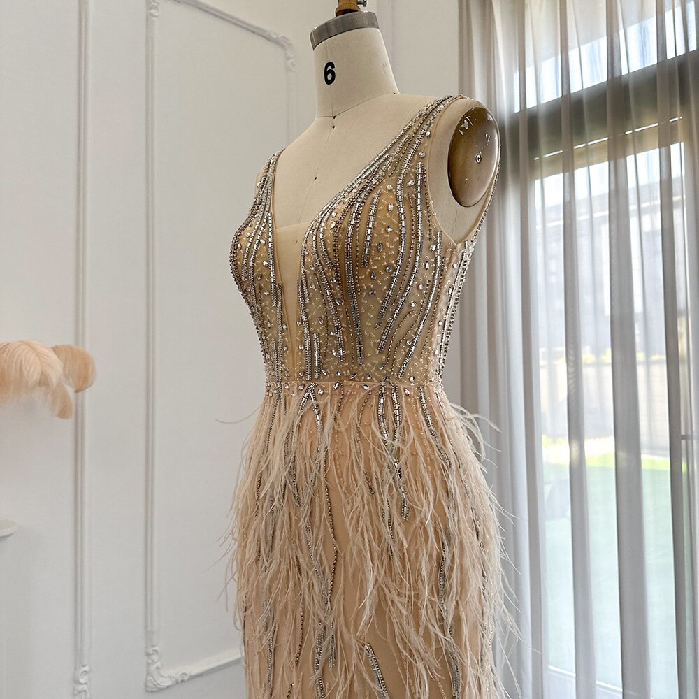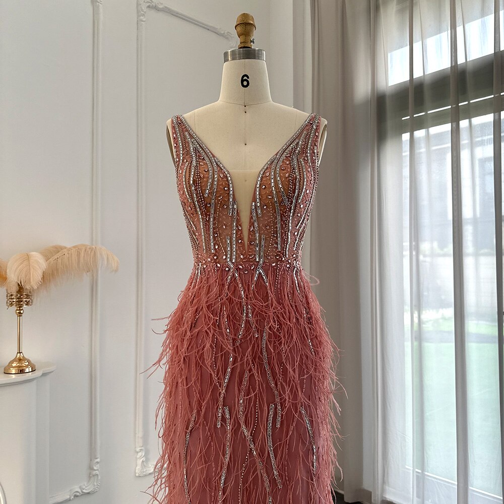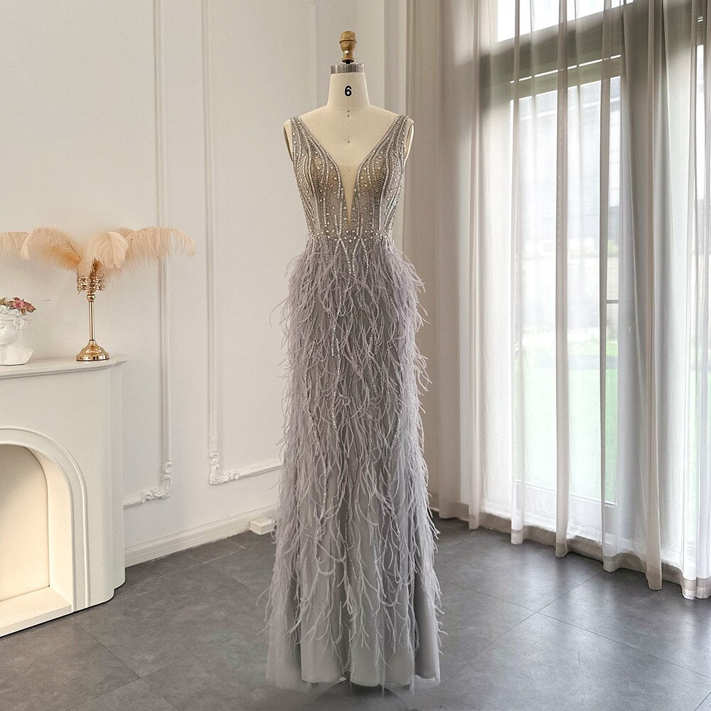 Este vestido de festa em V é elegante e luxuoso, com um acabamento em cristais que brilham ao longo do decote em V. A saia é feita de penas delicadas e leves, criando um efeito de movimento e profundidade disponíveis nas cores cinza, rosa empoeirado e champagne. O corte em V do decote e a saia em penas adicionam um toque de sensualidade e sofisticação ao vestido. O comprimento longo é perfeito para eventos formais e a modelagem ajustada ao corpo mostra sua silhueta de maneira elegante. Este vestido é perfeito para uma noite de gala.