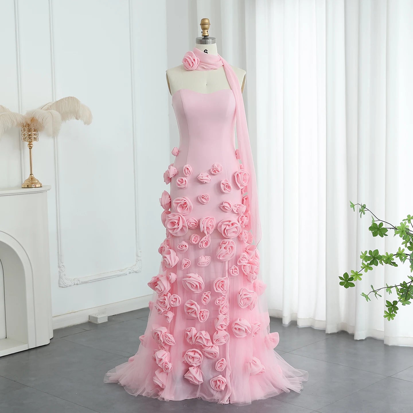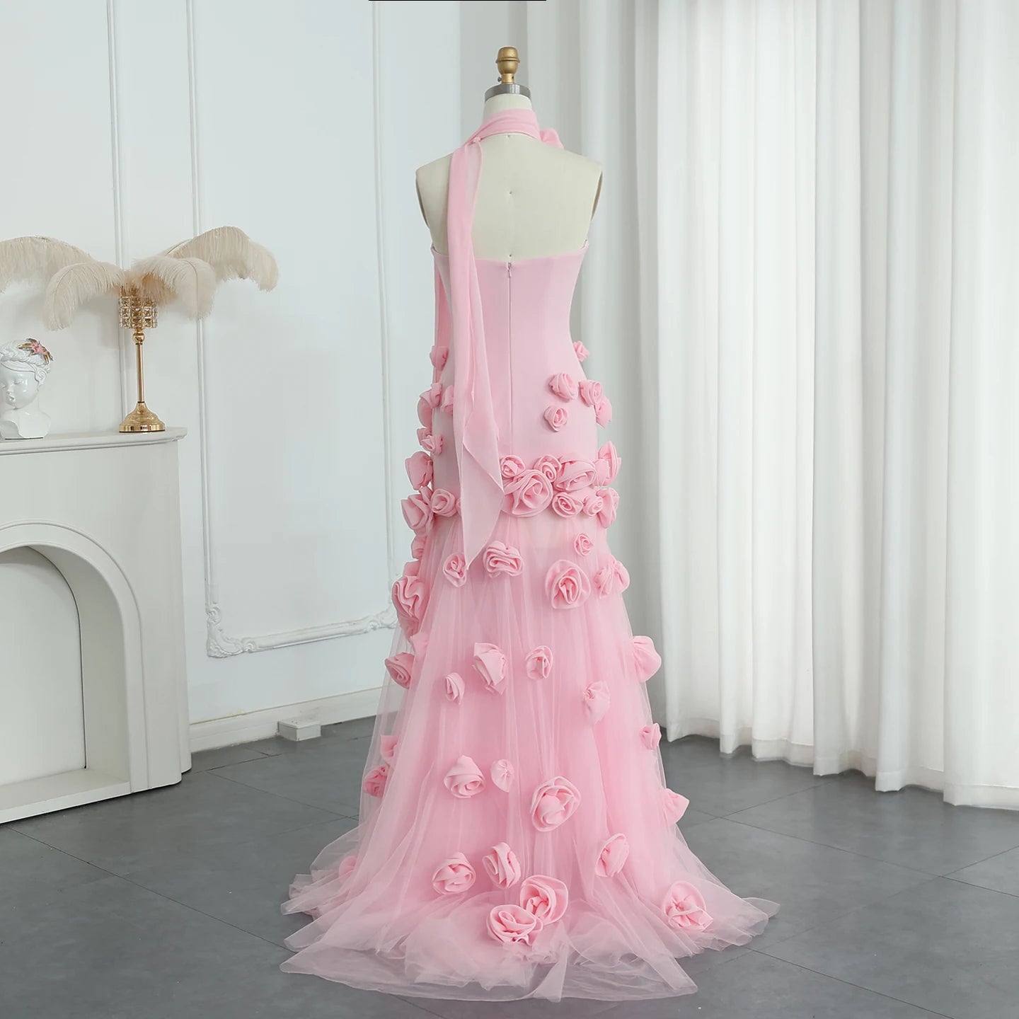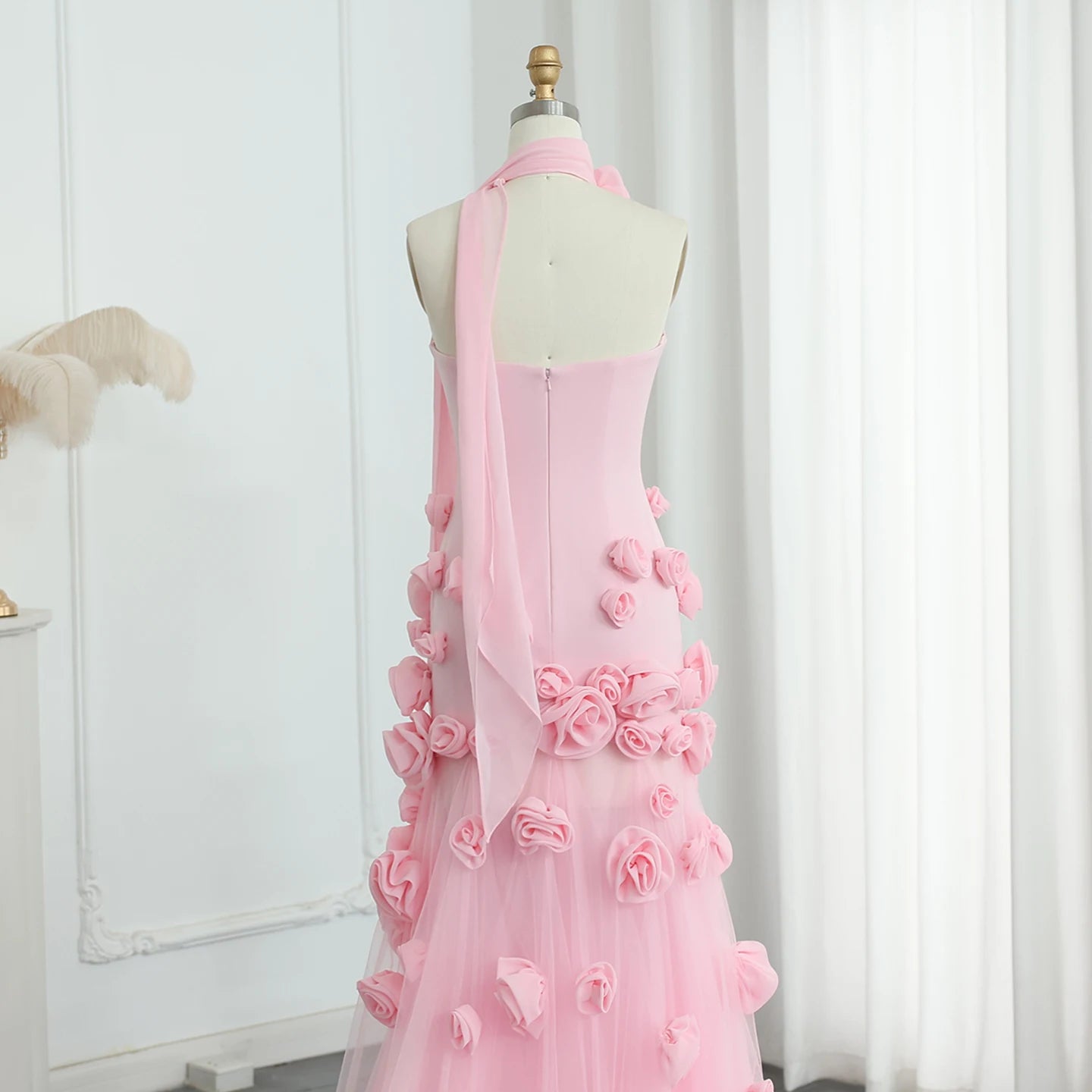 Vestido de Festa Luxo Alta Costura com Detalhes em Plumas
