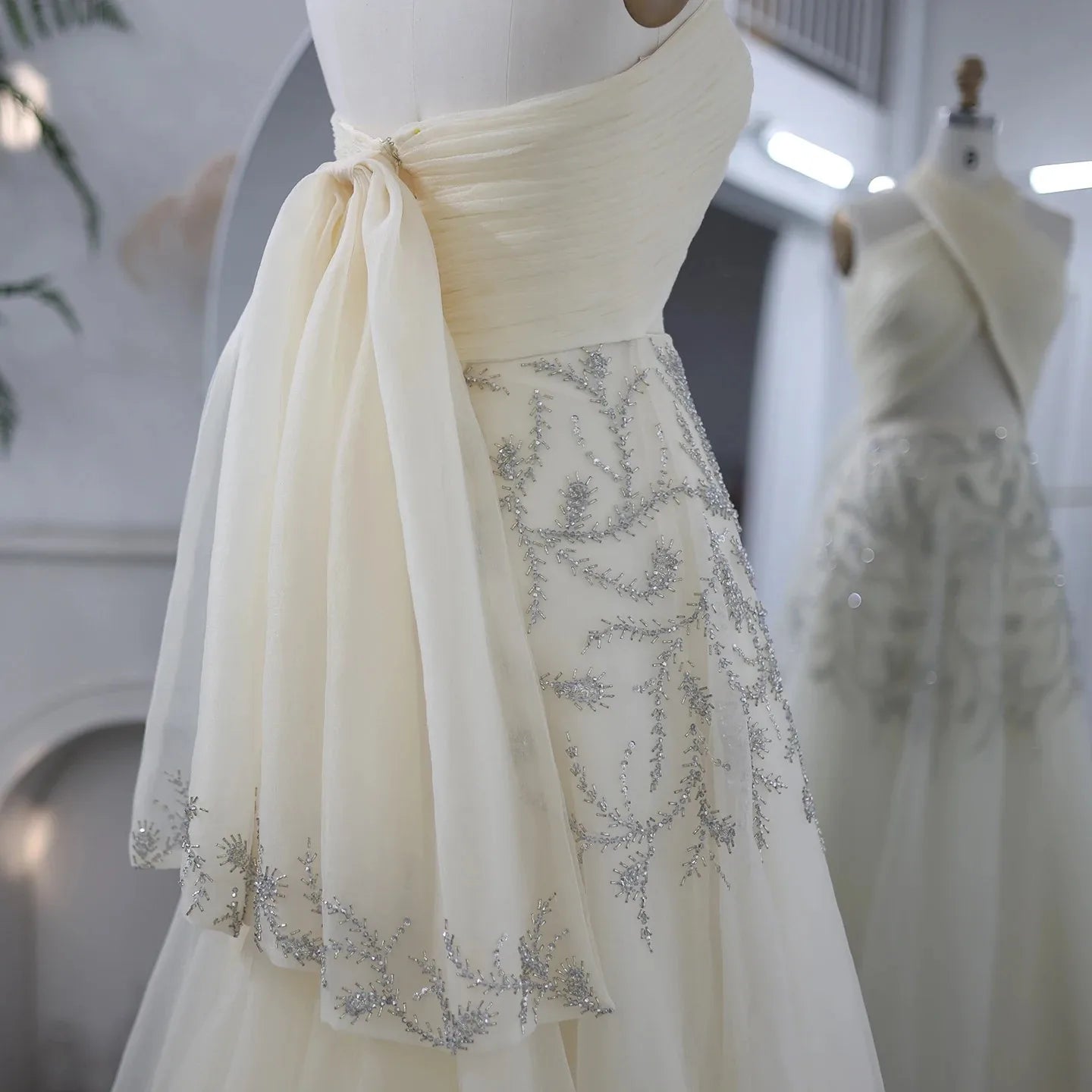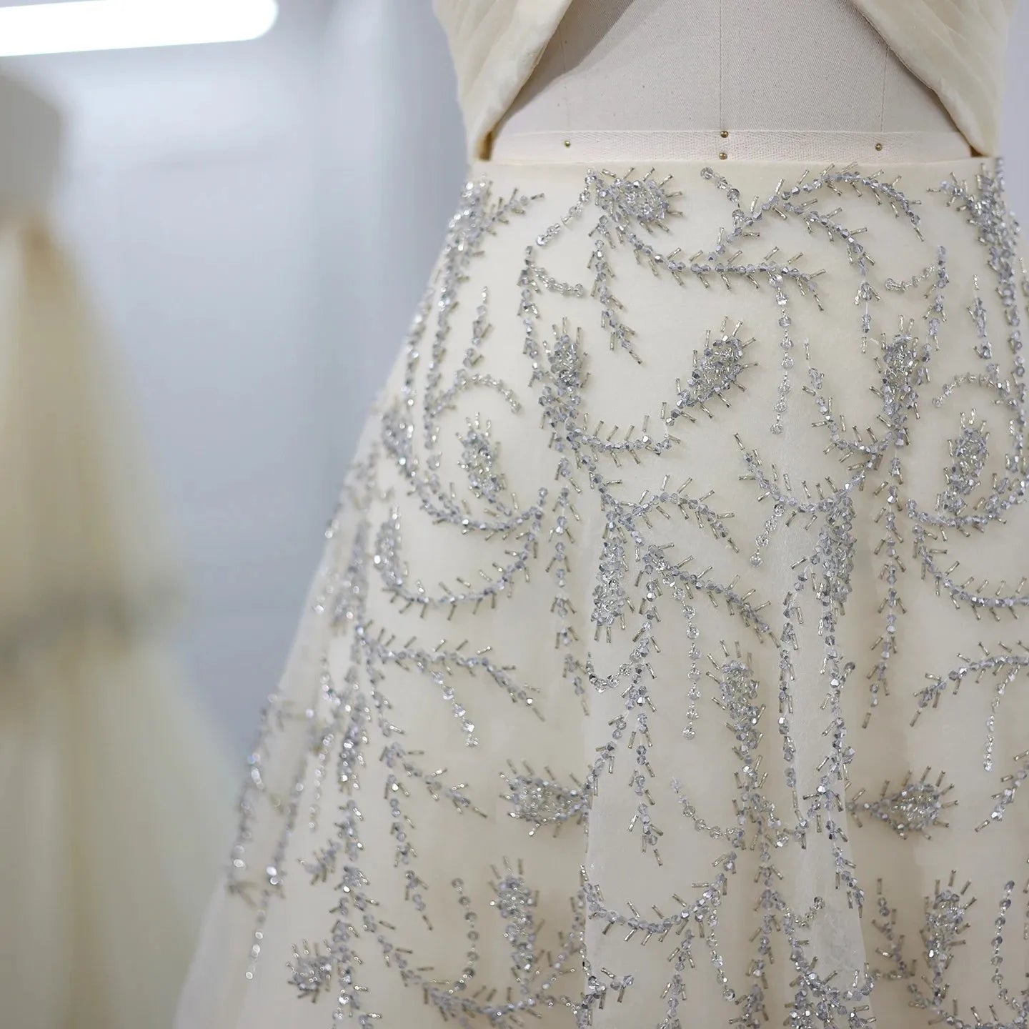 Esse vestido é ideal para quem deseja um look que seja ao mesmo tempo imponente e etéreo. A combinação da saia esvoaçante com o brilho elegante e o decote colar cria um conjunto harmonioso, perfeito para fazer uma entrada inesquecível em qualquer evento de gala.