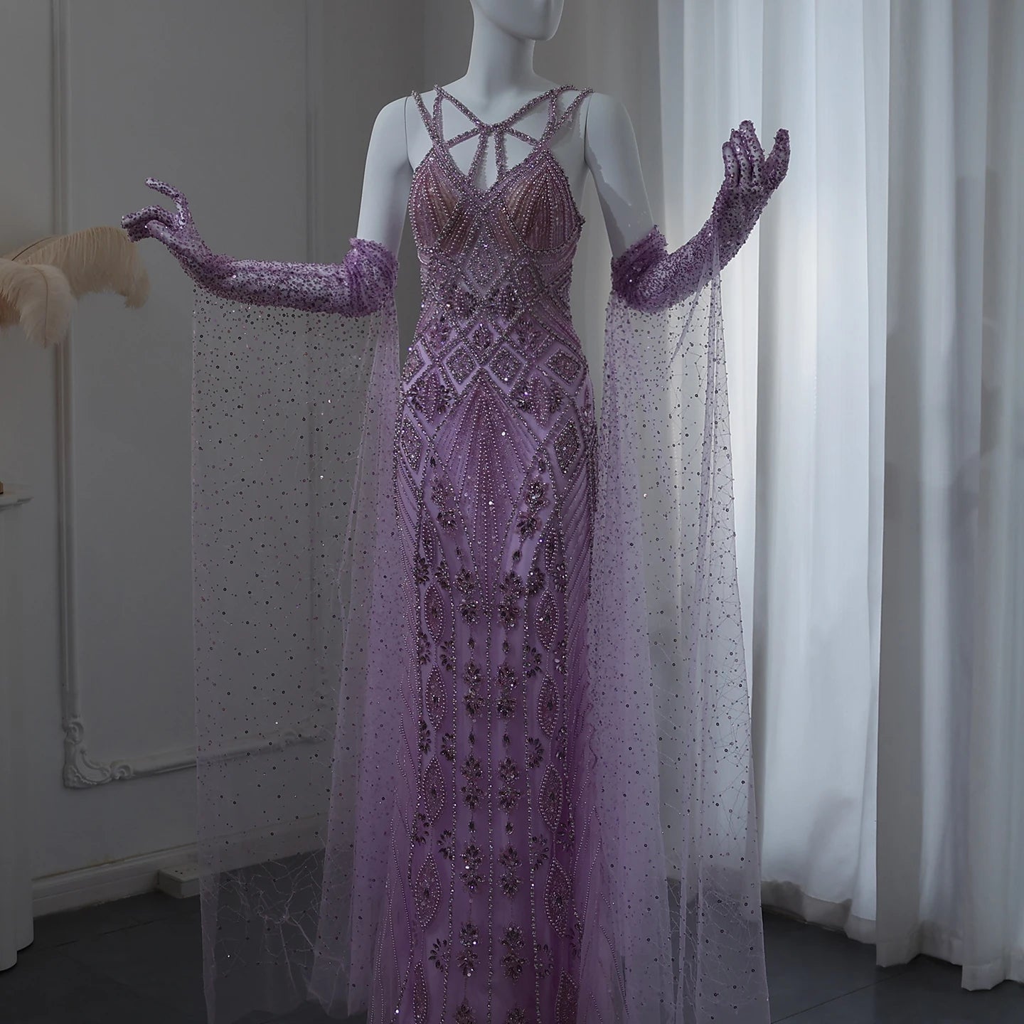 Vestido de Festa Maxi Luxo Adornado em Cristais com Capa Detalhada