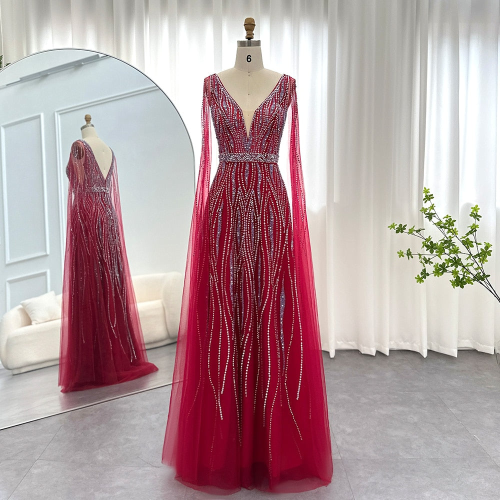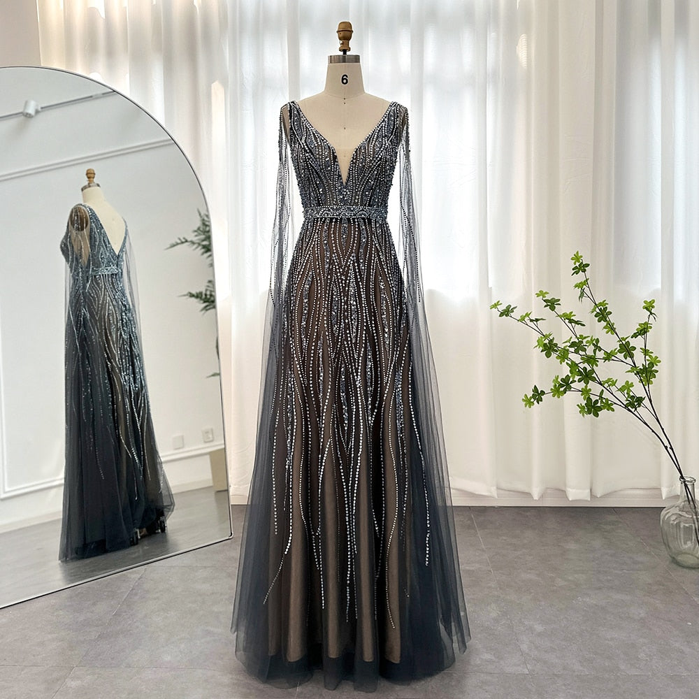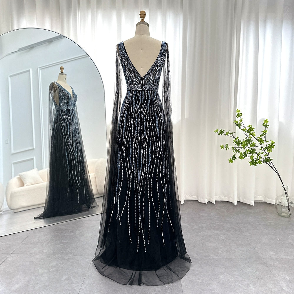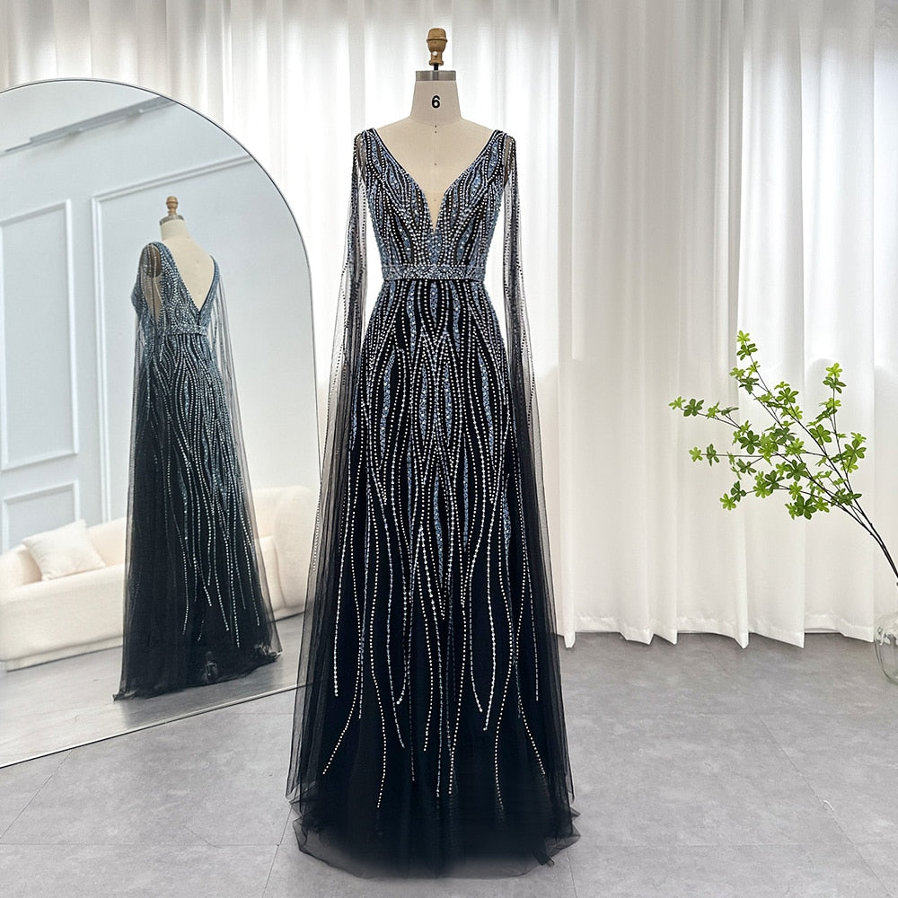 Este vestido de festa luxuoso é perfeito para mulheres que desejam se destacar em uma ocasião especial, como um casamento ou baile de formatura. Seu design elegante e sofisticado é complementado pela decoração de cristais brilhantes e manga capa em strass, criando um visual impressionante e inesquecível. Se você quer ser o centro das atenções, este é o vestido perfeito para você.