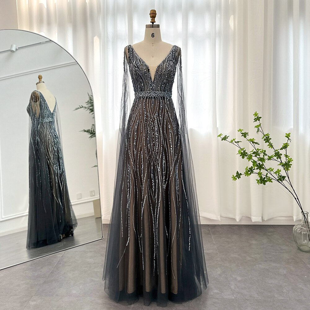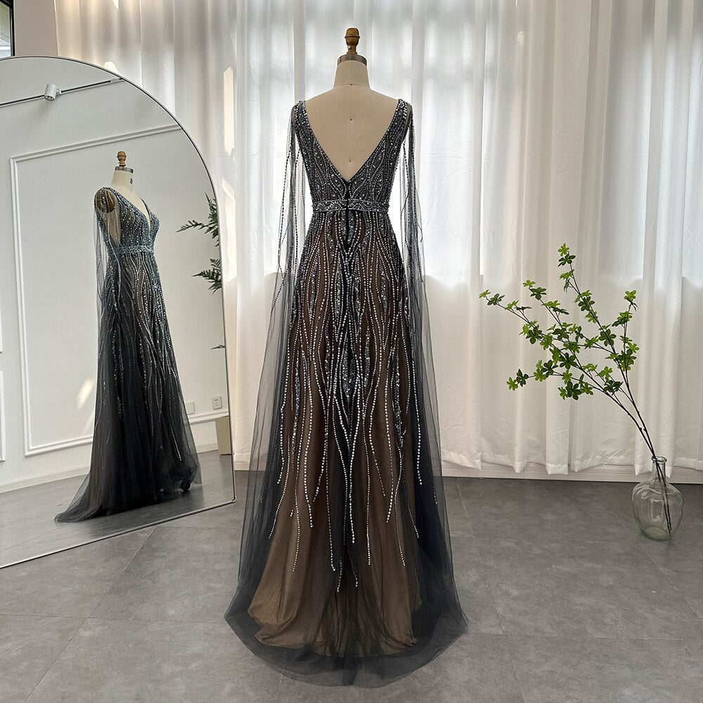O design do vestido apresenta uma manga capa decorada em strass, criando um efeito deslumbrante que atrai a atenção de todos ao seu redor. Sua capa flui elegantemente, adicionando um toque de drama e glamour ao visual.