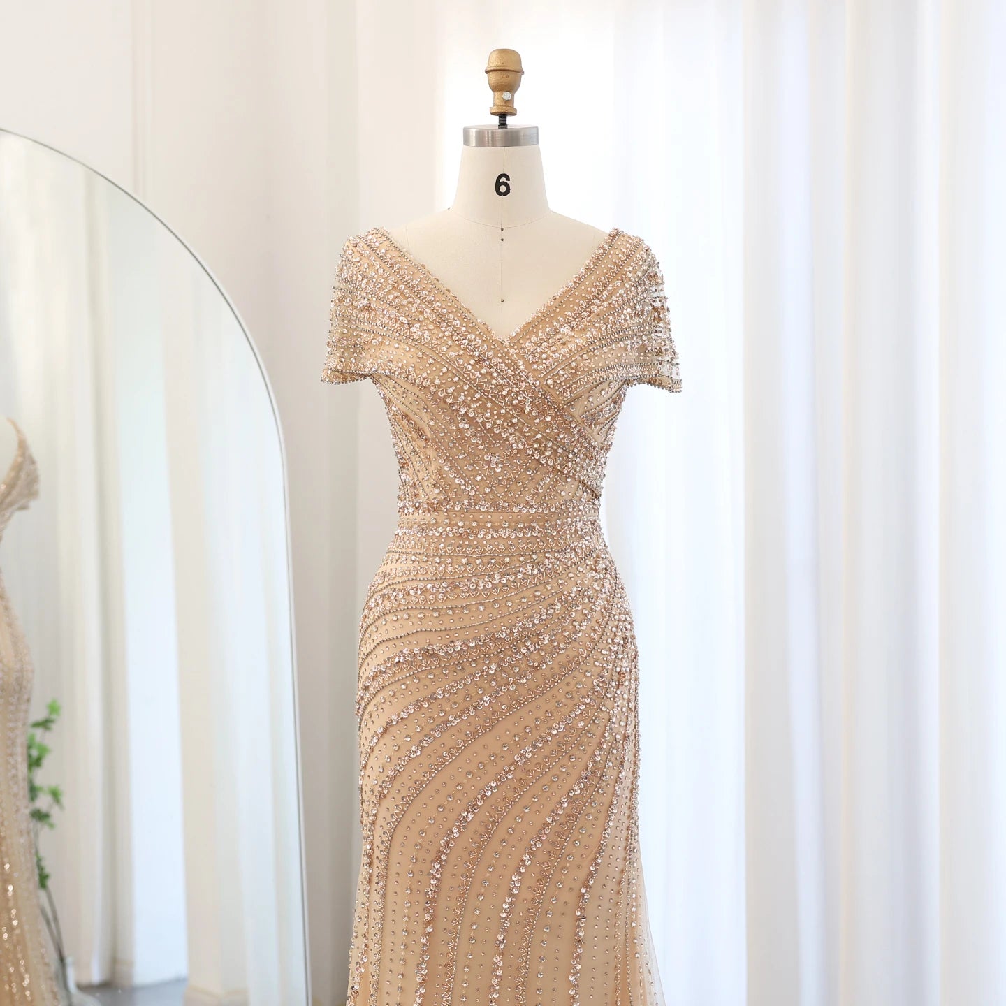 Este vestido oferece uma opção adicional para quem prefere um look mais clássico e elegante. A ausência de mangas mantém o foco na intricada decoração de pedrarias, fazendo deste traje uma escolha perfeita para se destacar em qualquer evento.