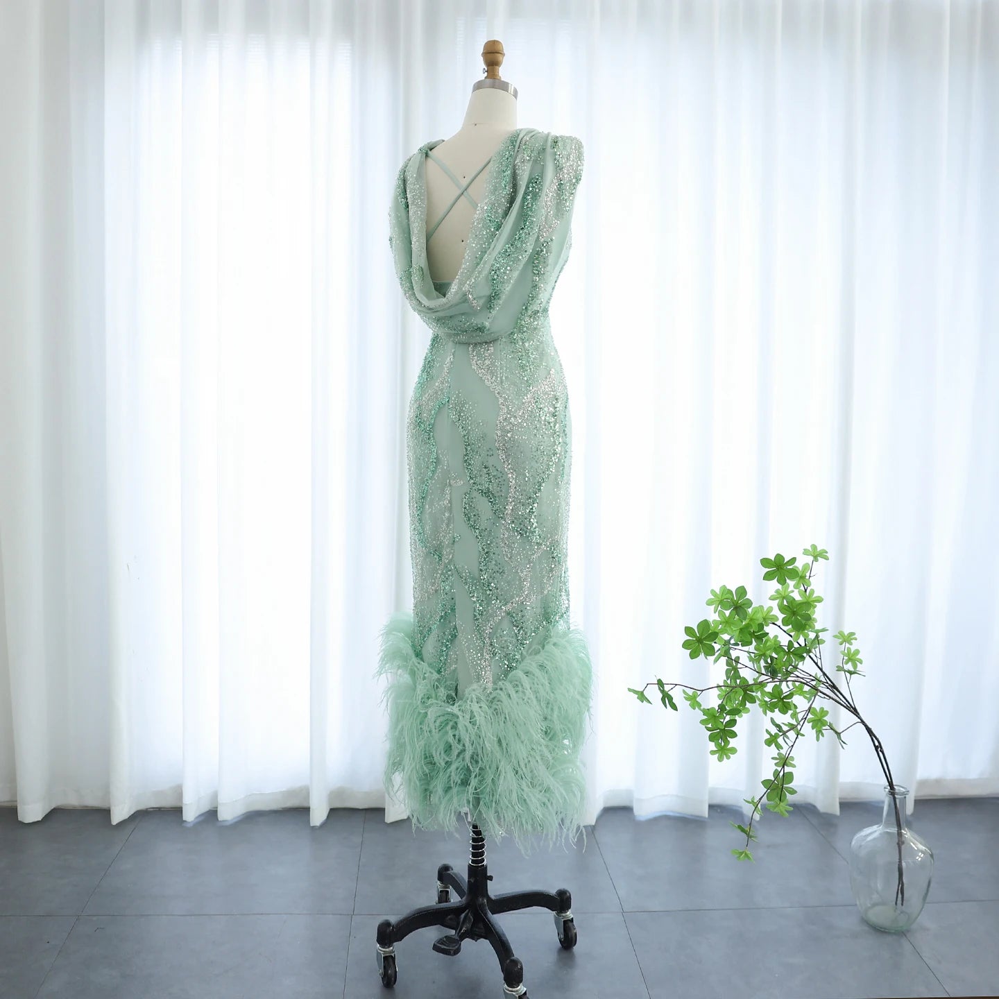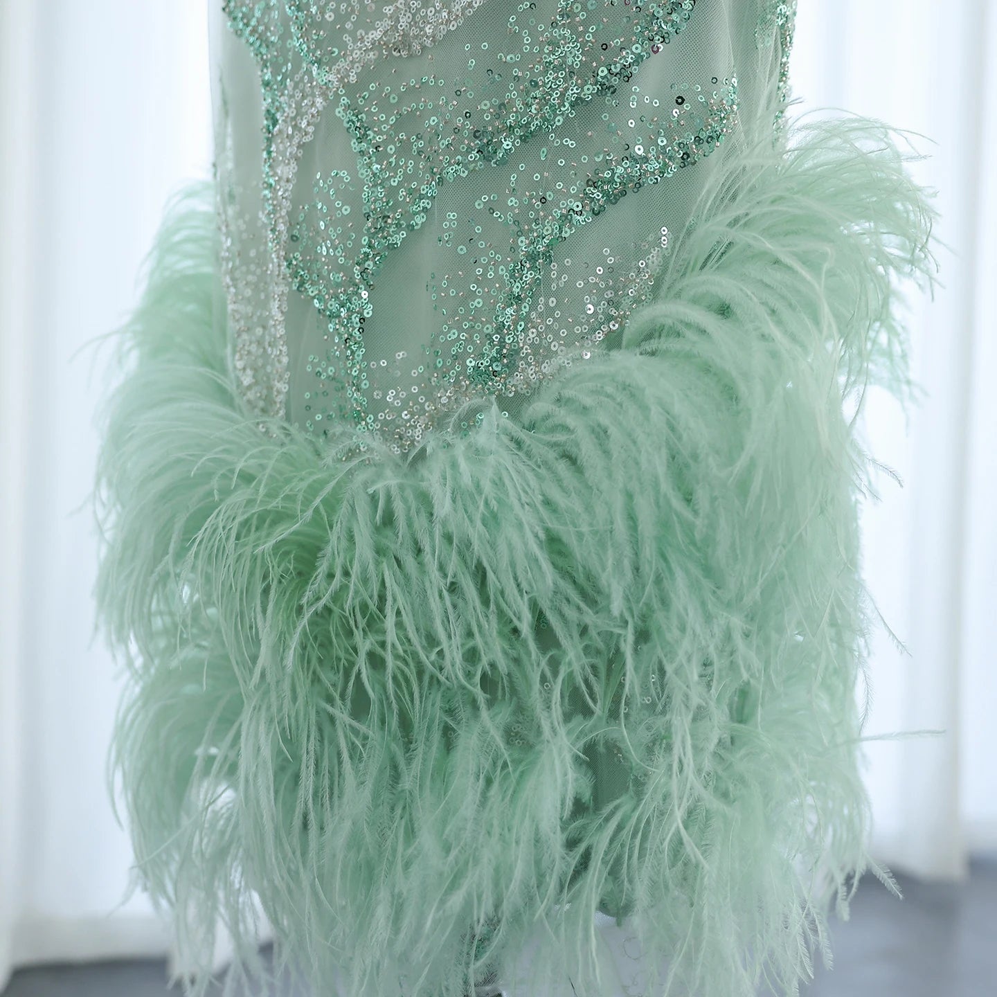Vestido de Festa Charmoso Verde Water com Plumas