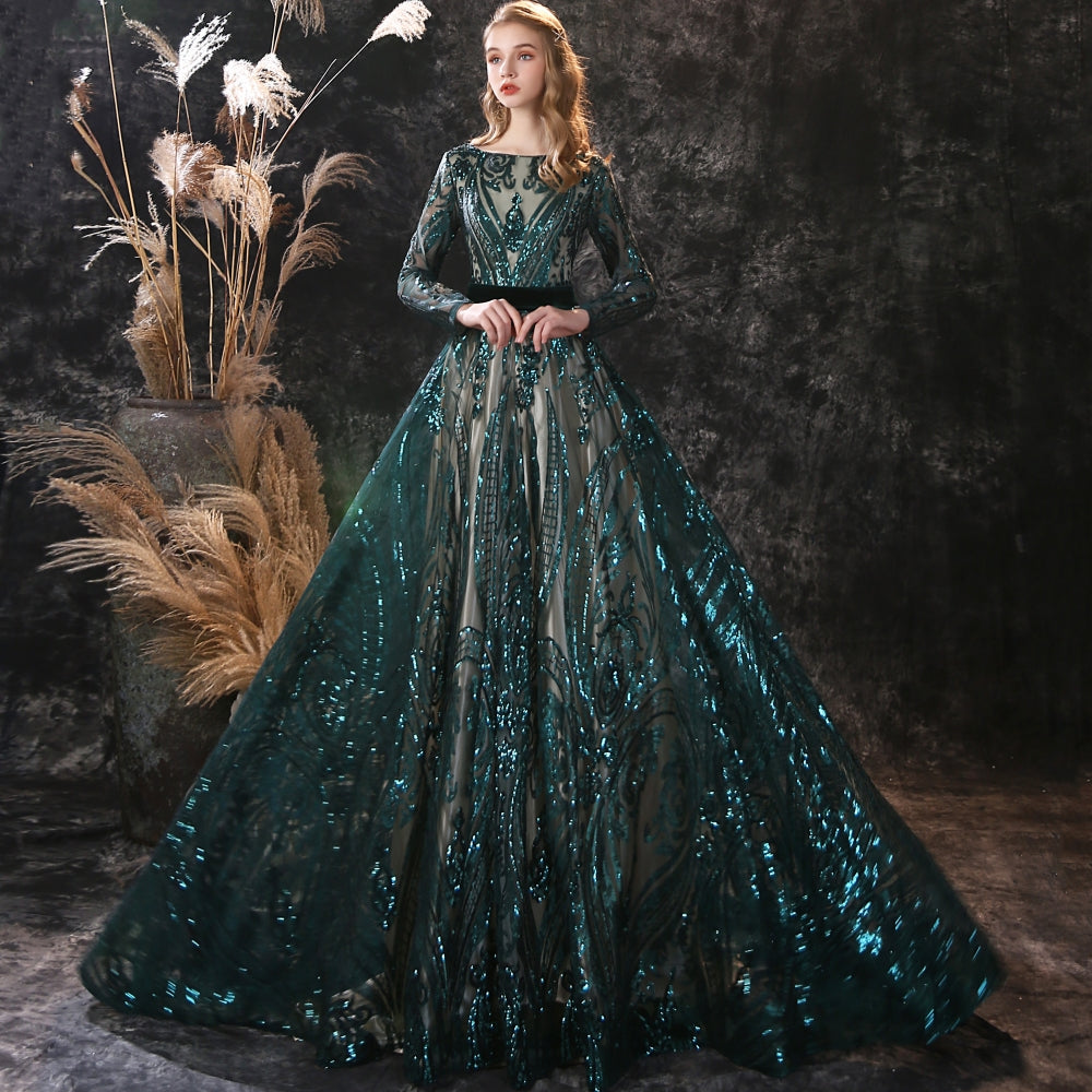 Um vestido de festa elegante longo verde escuro é uma peça elegante. O comprimento longo e a cor verde escuro cria uma silhueta clássica e chique. A manga longa adiciona um toque de elegância e sofisticação ao vestido, enquanto a cor verde escuro dá um toque de sofisticação e dramatismo. Esse vestido é perfeito para uma ocasião formal, como um baile de gala ou casamento, e fará com que a pessoa que o vestir se destaque na multidão.
