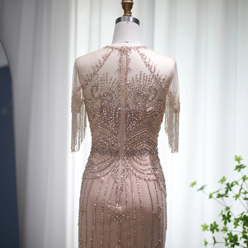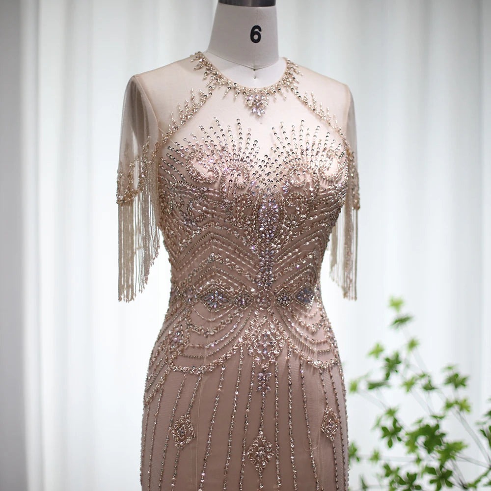 Vestido de Festa Longo com Manga em Cristais Champanhe - Modelo Especial
