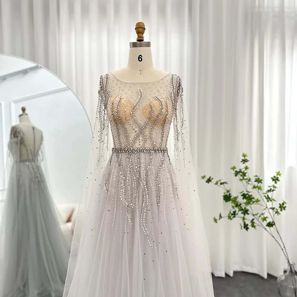 Vestido de Festa Maxi Luxo Adornado em Cristais com Capa Detalhada