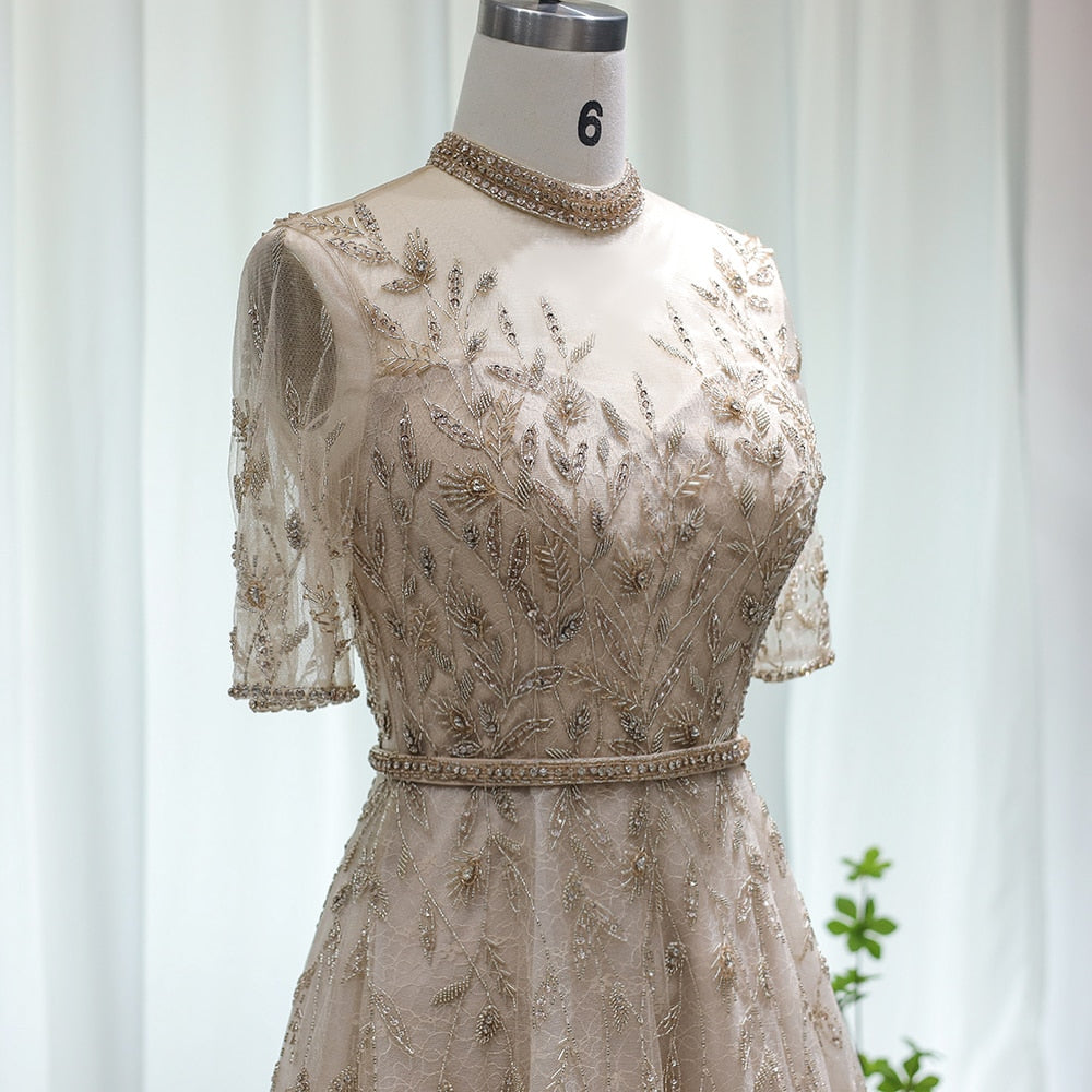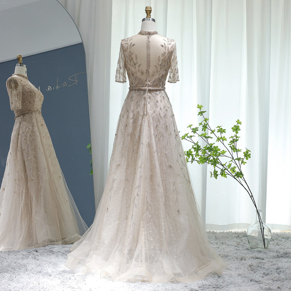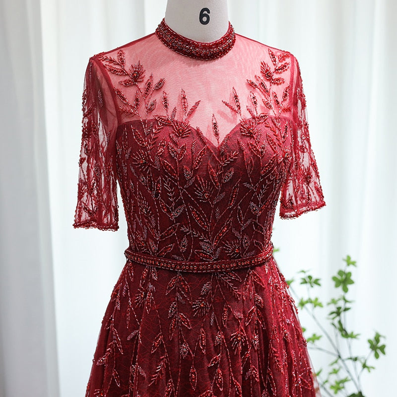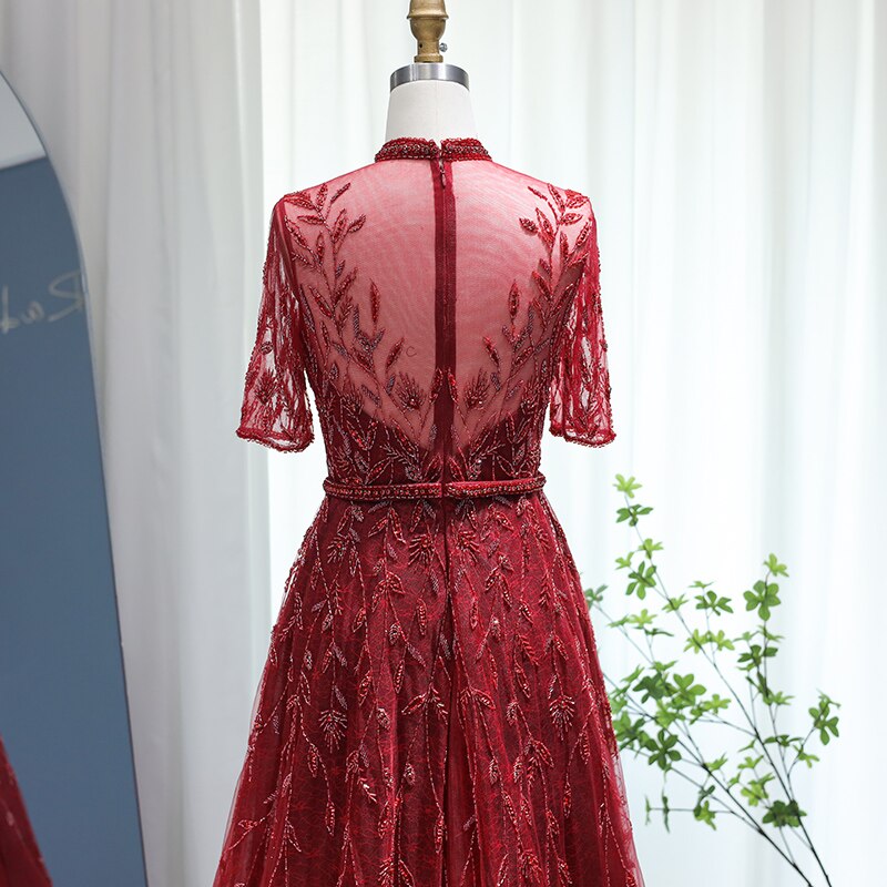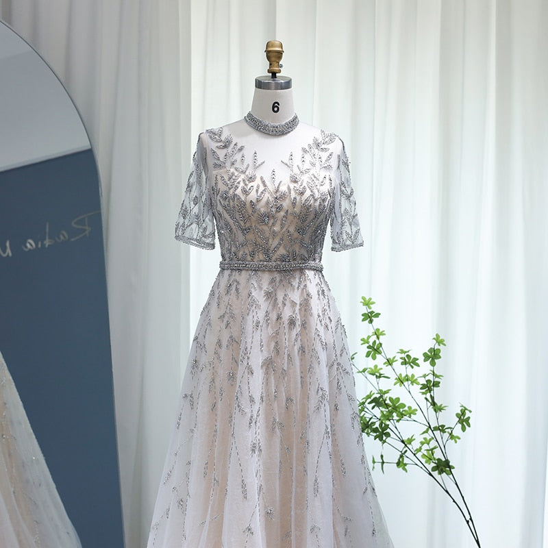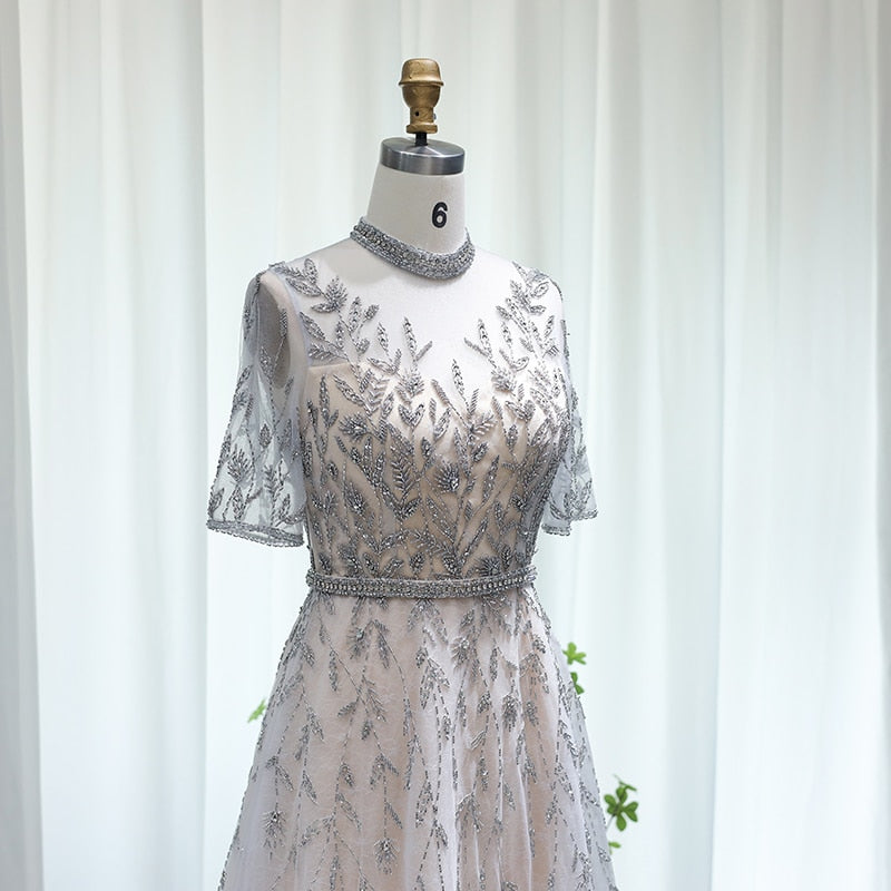 Este vestido de festa luxuoso é um exemplo de elegância refinada. Feito com um tecido de alta qualidade, ele é adornado com cristais em um padrão folhagem sofisticado. Esses cristais são dispostos de maneira delicada e elegante, criando um efeito visual deslumbrante e luxuoso.