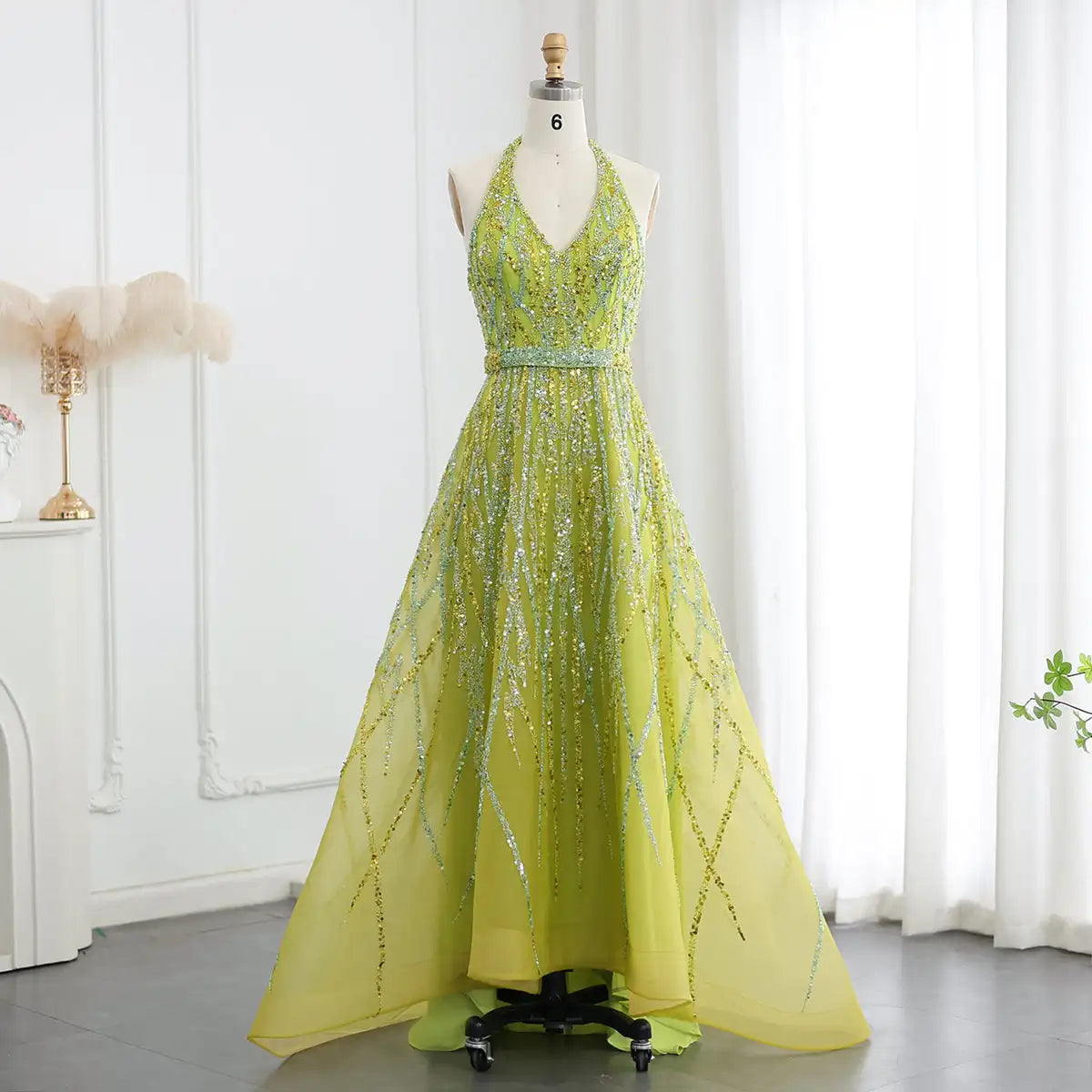 Este deslumbrante Vestido de Festa Verde Cristais com Decote Halter combina sofisticação e charme, ideal para ocasiões especiais como casamentos e festas de gala. Com um elegante decote em V e uma silhueta A-line, ele proporciona um caimento impecável, realçando a beleza e a elegância de quem o usa. Feito com chiffon de alta qualidade e detalhes luxuosos, como bordados, aplicações de renda, drapeados e camadas volumosas, o vestido transmite uma sensação de leveza e requinte. A cauda varrendo o chão completa o look, dando um toque de glamour ao visual.
