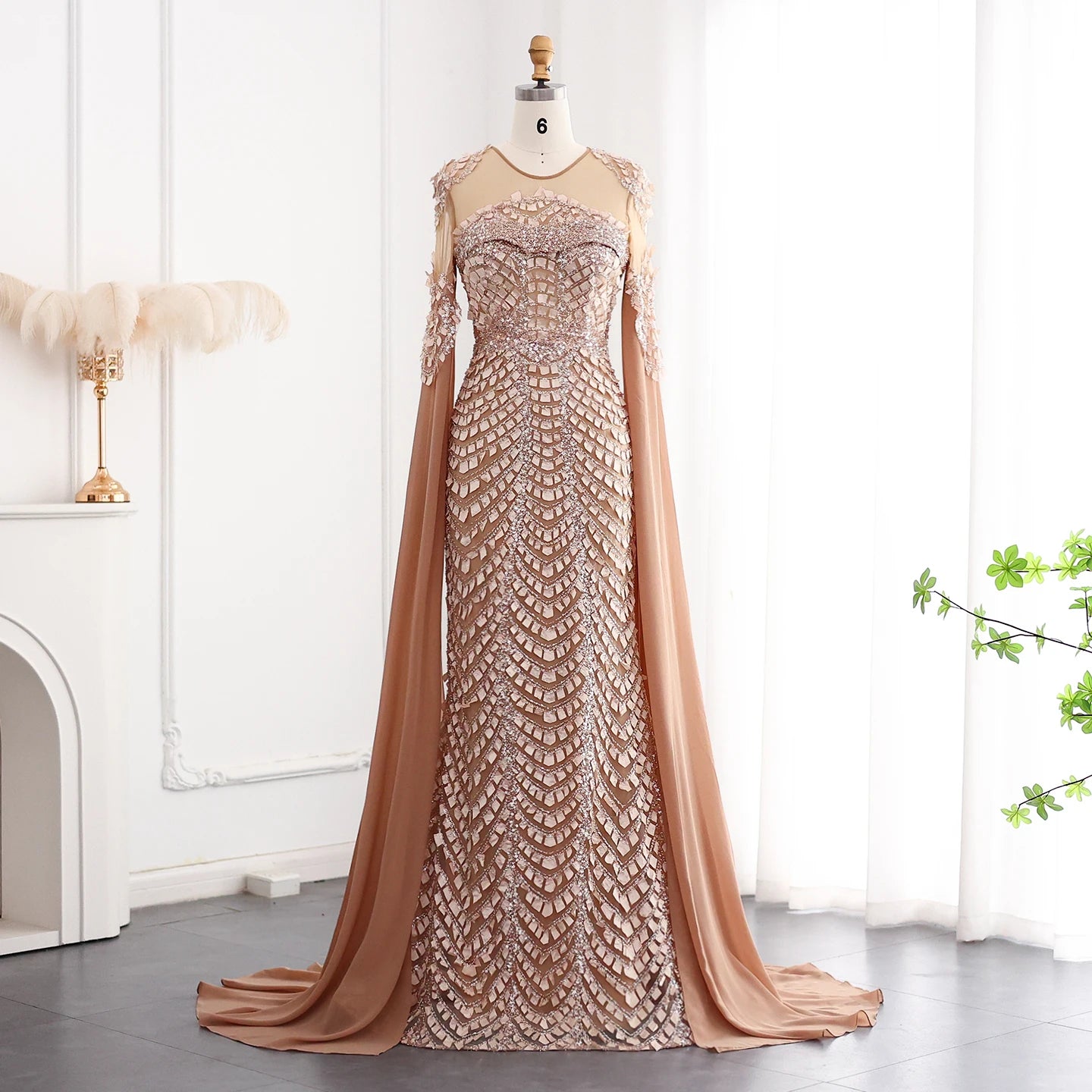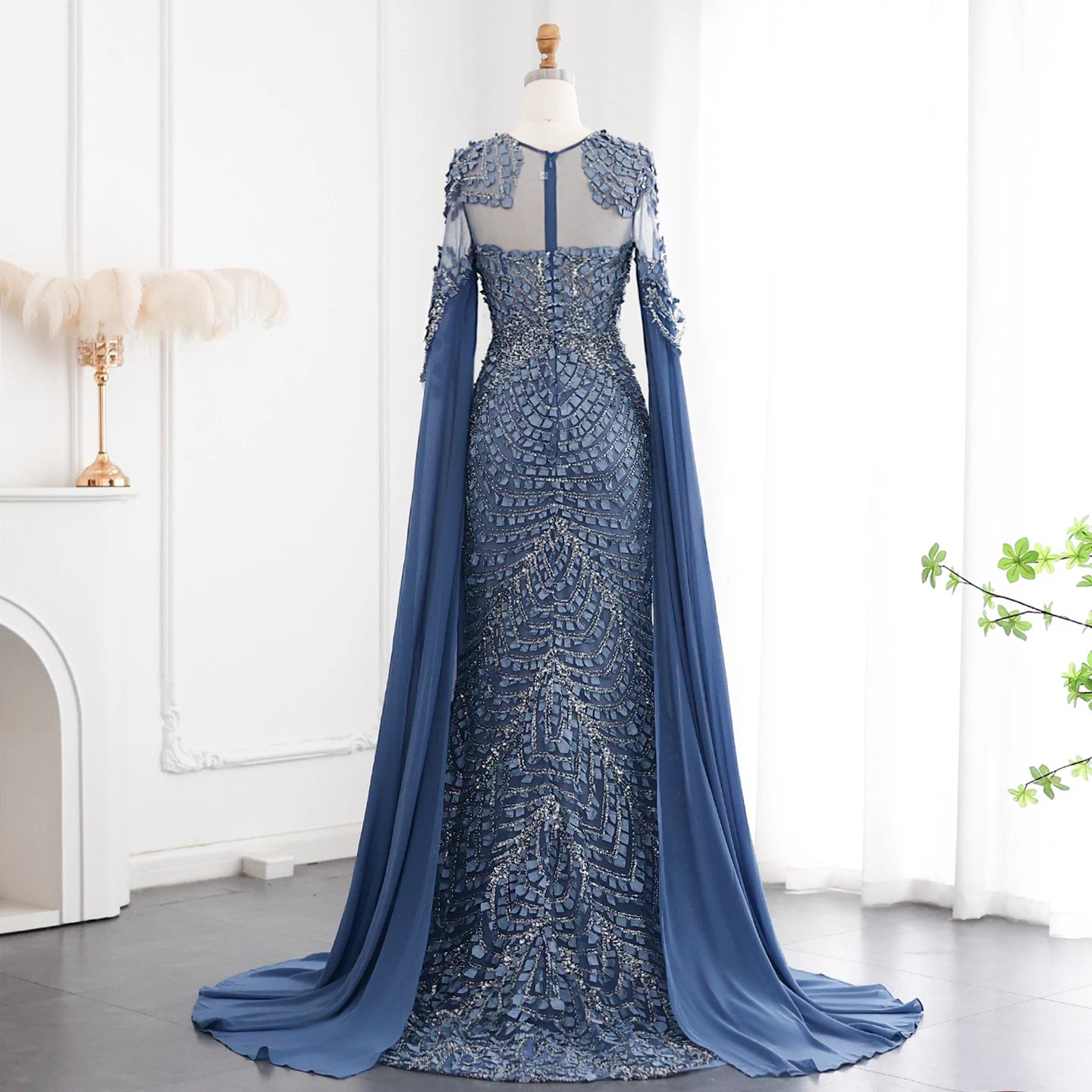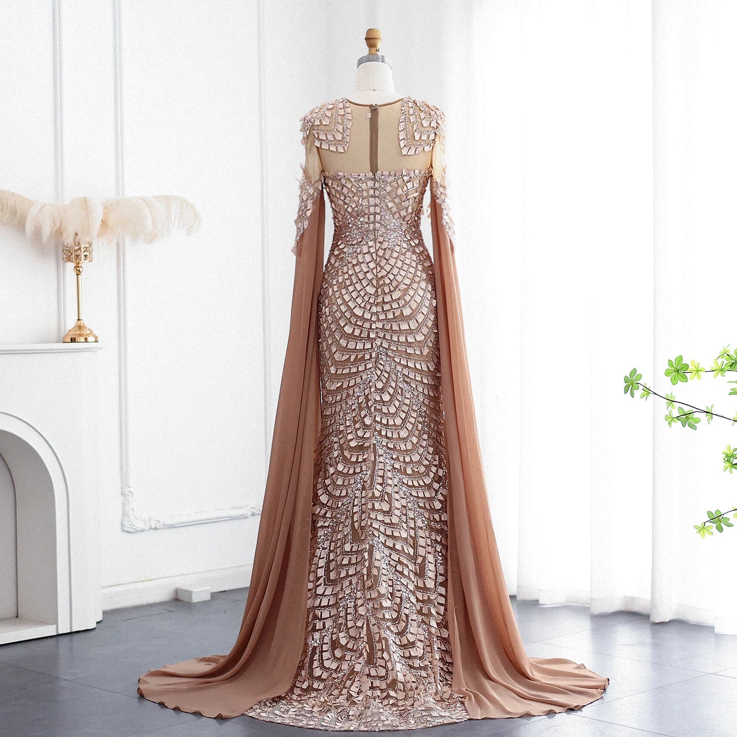 Vestido de Festa Maxi Luxo Adornado em Cristais com Capa Detalhada
