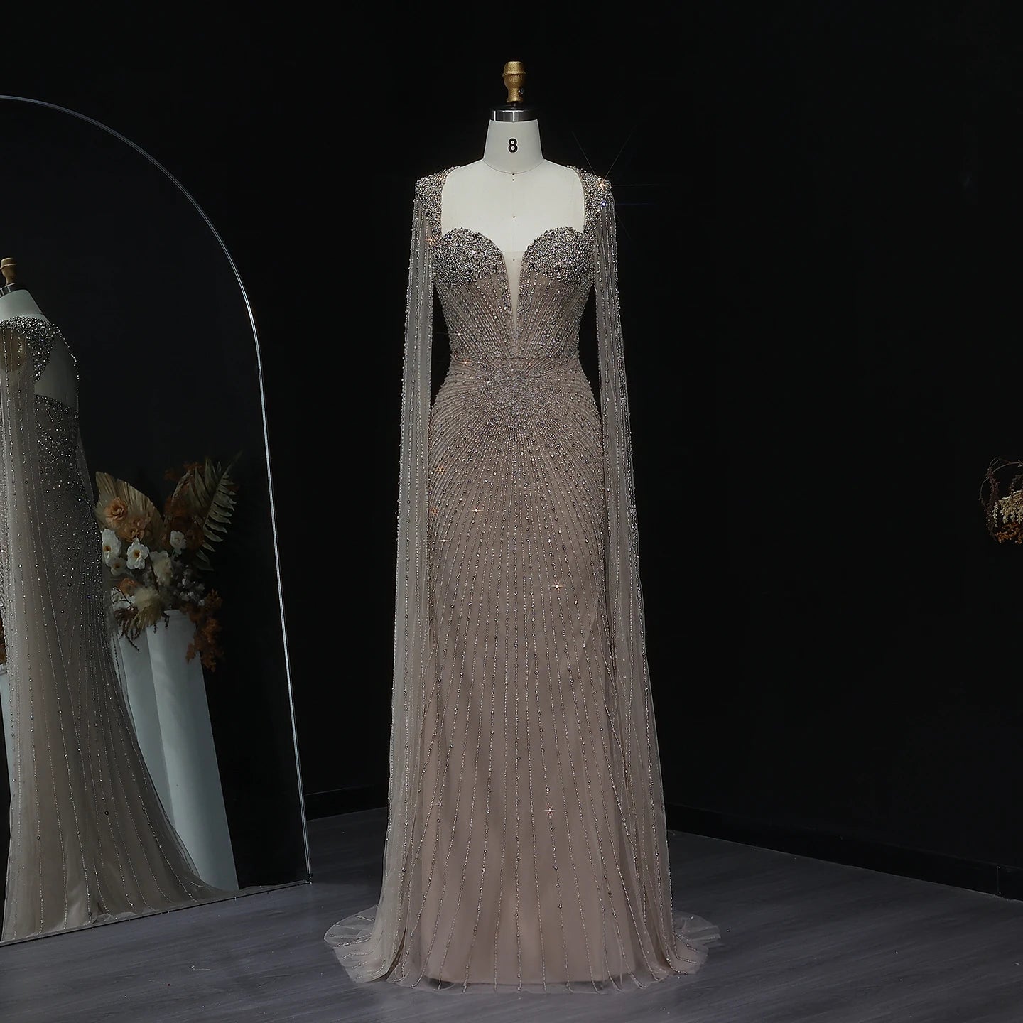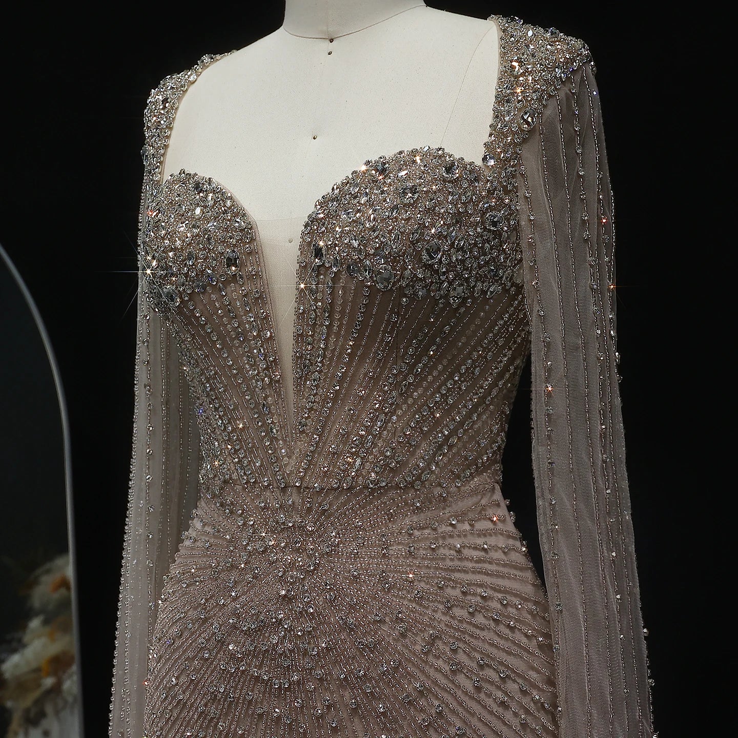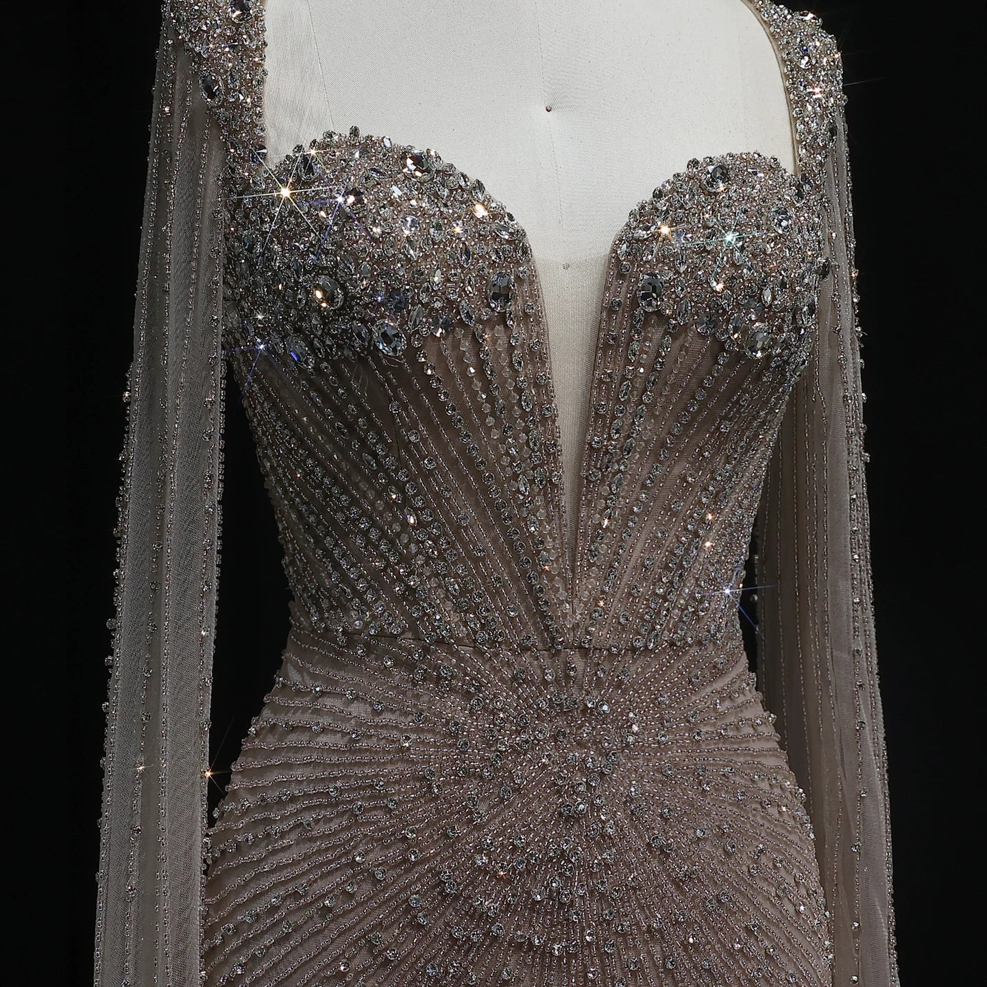 Confeccionado em tule francês bordado com fios metálicos, o modelo apresenta uma silhueta sereia estruturada, que abraça o corpo com elegância escultural. O decote coração profundo, sustentado por estrutura interna de alta costura, é realçado por um bordado minucioso em cristais lapidados, contas translúcidas e microcanutilhos dourados, que desenham feixes de luz ascendentes. A capa longa integrada aos ombros, feita em tule bordado com o mesmo padrão de cristais, cria um efeito de realeza etérea em movimento. O forro em seda pura acetinada assegura conforto e luxo, enquanto o fechamento posterior em zíper invisível mantém o acabamento impecável.