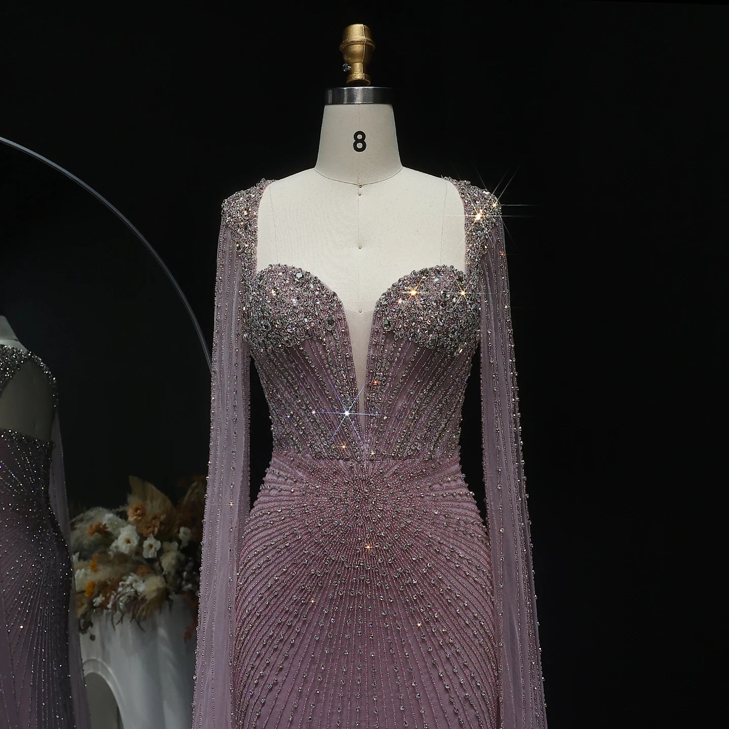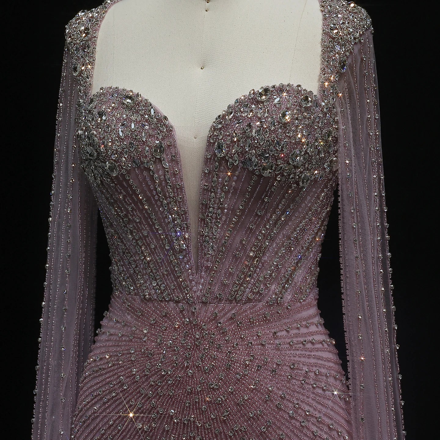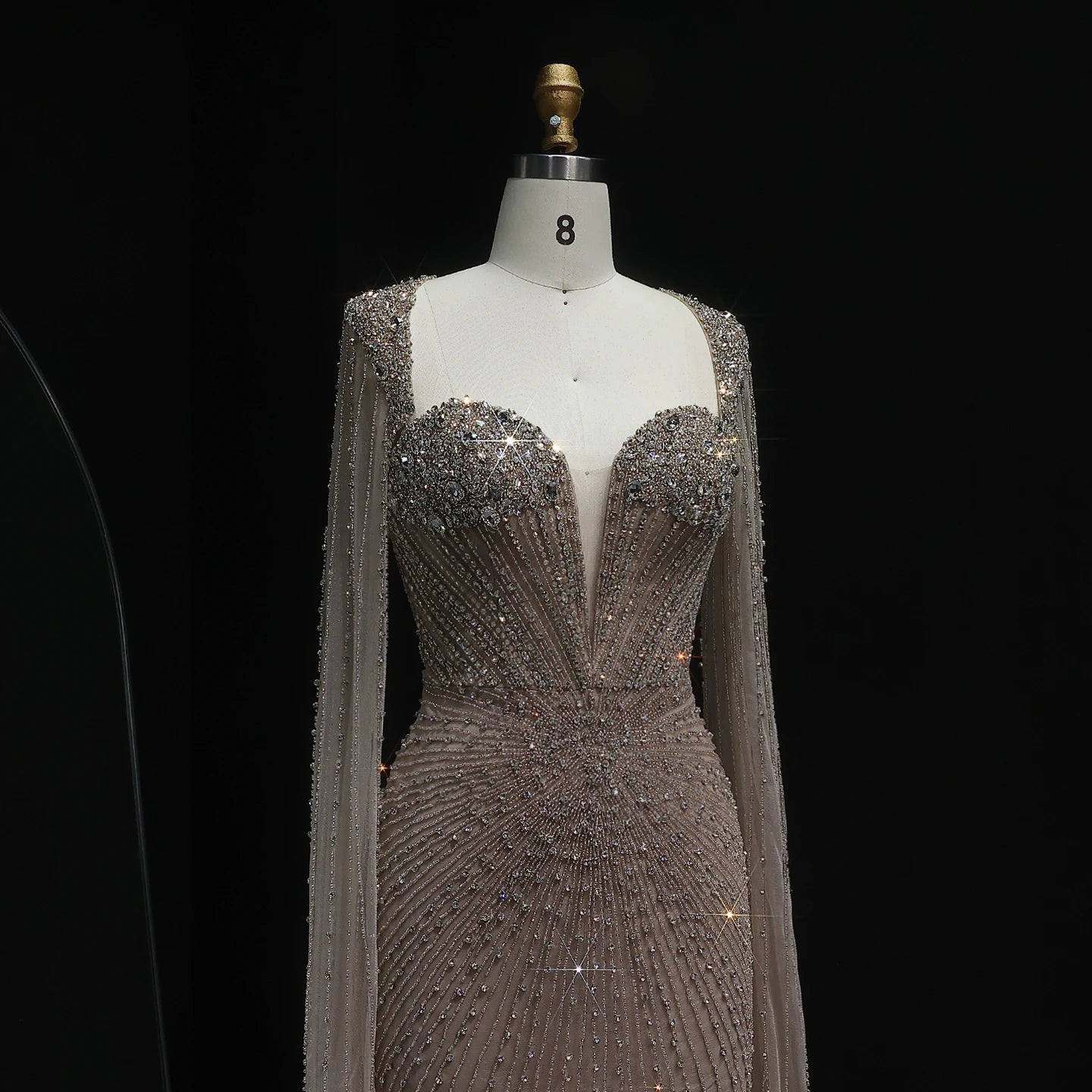 Confeccionado em tule francês bordado com fios metálicos, o modelo apresenta uma silhueta sereia estruturada, que abraça o corpo com elegância escultural. O decote coração profundo, sustentado por estrutura interna de alta costura, é realçado por um bordado minucioso em cristais lapidados, contas translúcidas e microcanutilhos dourados, que desenham feixes de luz ascendentes. A capa longa integrada aos ombros, feita em tule bordado com o mesmo padrão de cristais, cria um efeito de realeza etérea em movimento. O forro em seda pura acetinada assegura conforto e luxo, enquanto o fechamento posterior em zíper invisível mantém o acabamento impecável.