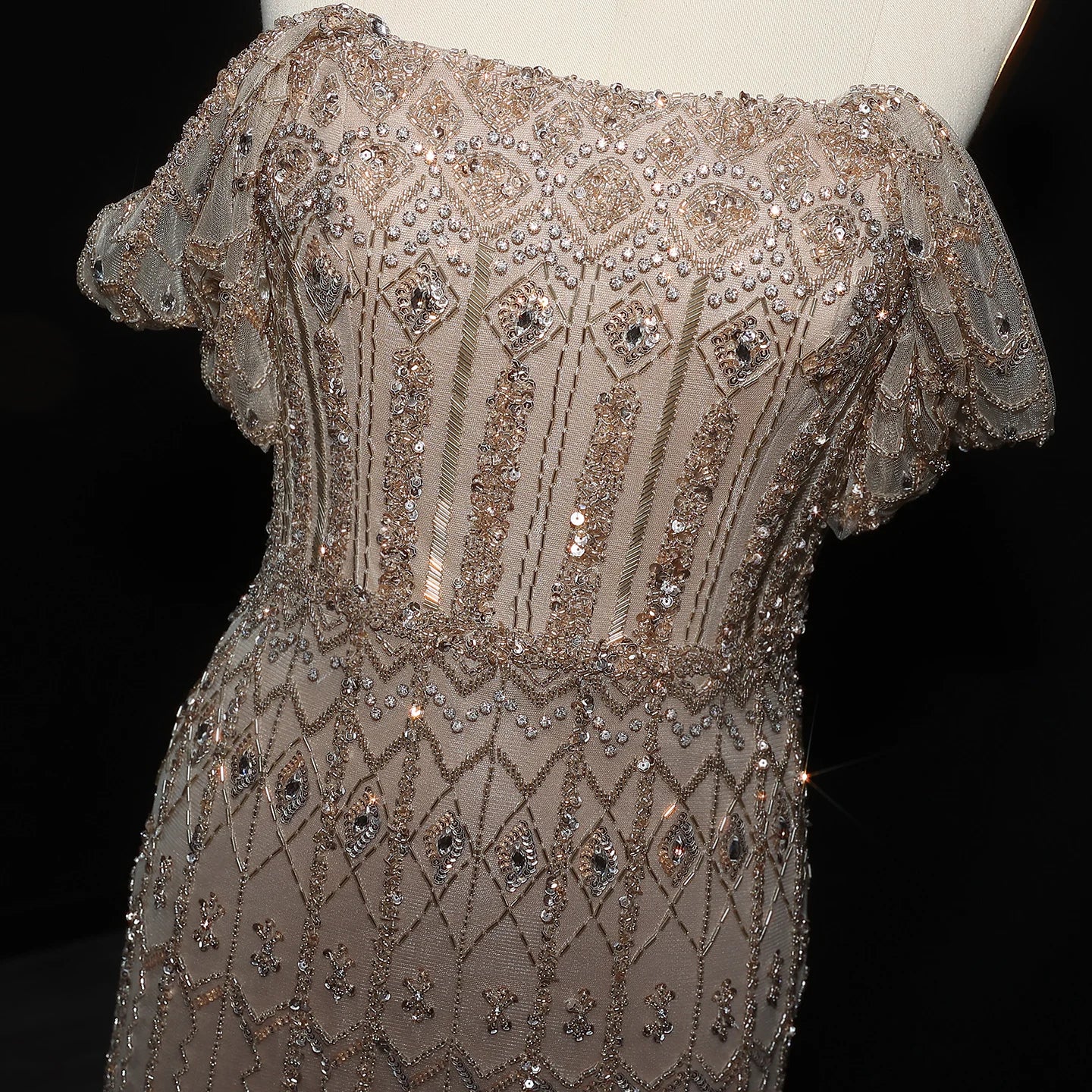 O Vestido de Festa Luxo Rosée Antique é uma ode à feminilidade clássica, reinterpretada com a precisão da alta-costura contemporânea. Confeccionado em tule rosé pálido bordado à mão com pedrarias e microcristais em padrões geométricos e florais, ele combina harmonia entre textura, brilho e silhueta.