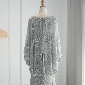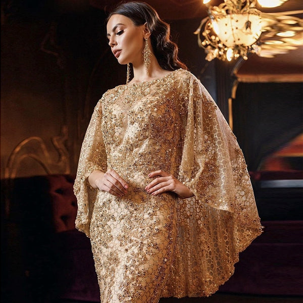 Este vestido de festa é uma obra-prima de moda e elegância. Combinando o brilho de cores dourada, prateado e verde, ele tem um estilo angelical, com sua manga capa longa e flutuante que adiciona um toque etéreo e dramático. A silhueta longa é deslumbrante e sofisticada, e as cores brilhantes são perfeitas para a noite. Este vestido certamente irá chamar a atenção e fazer você brilhar em qualquer festa.