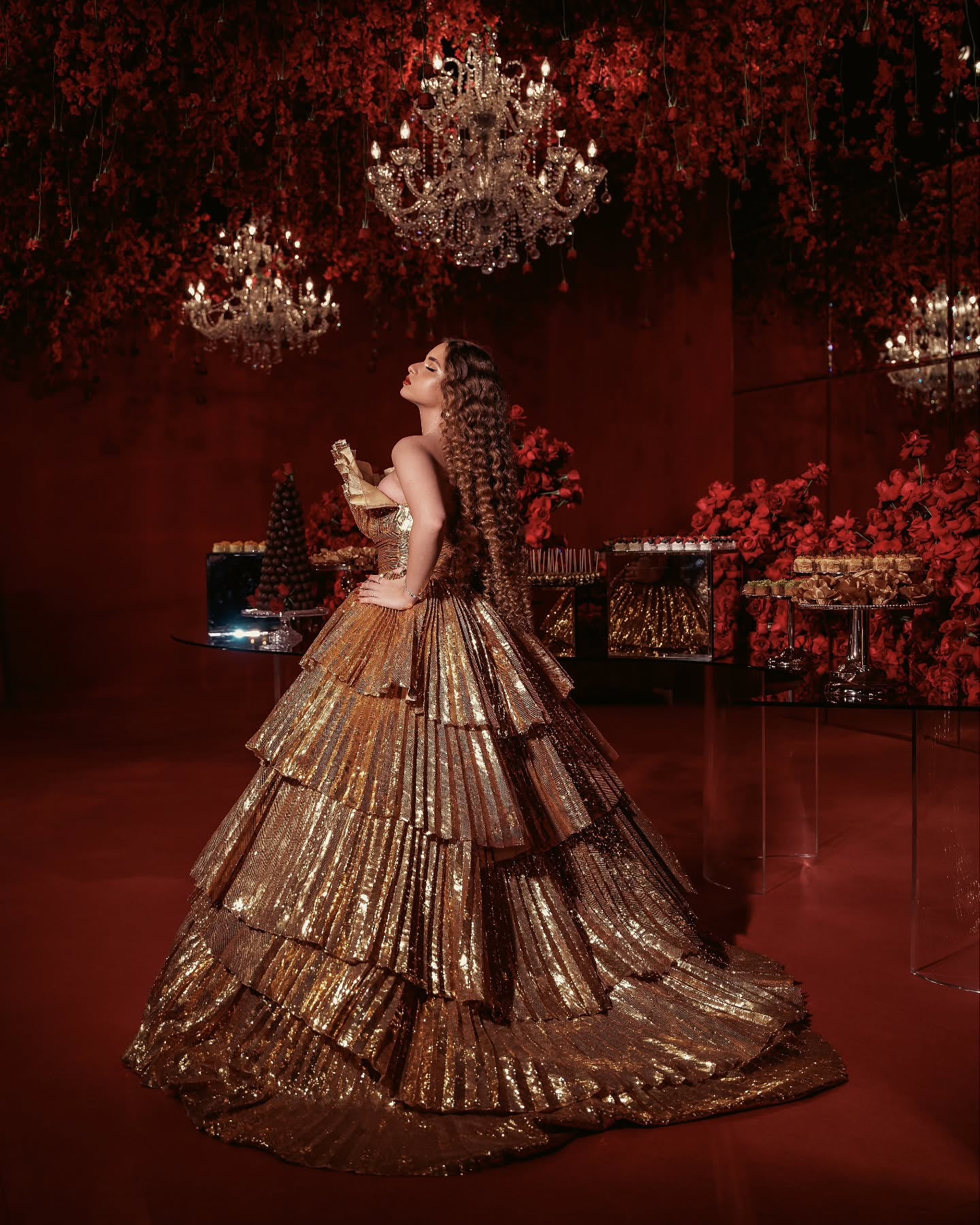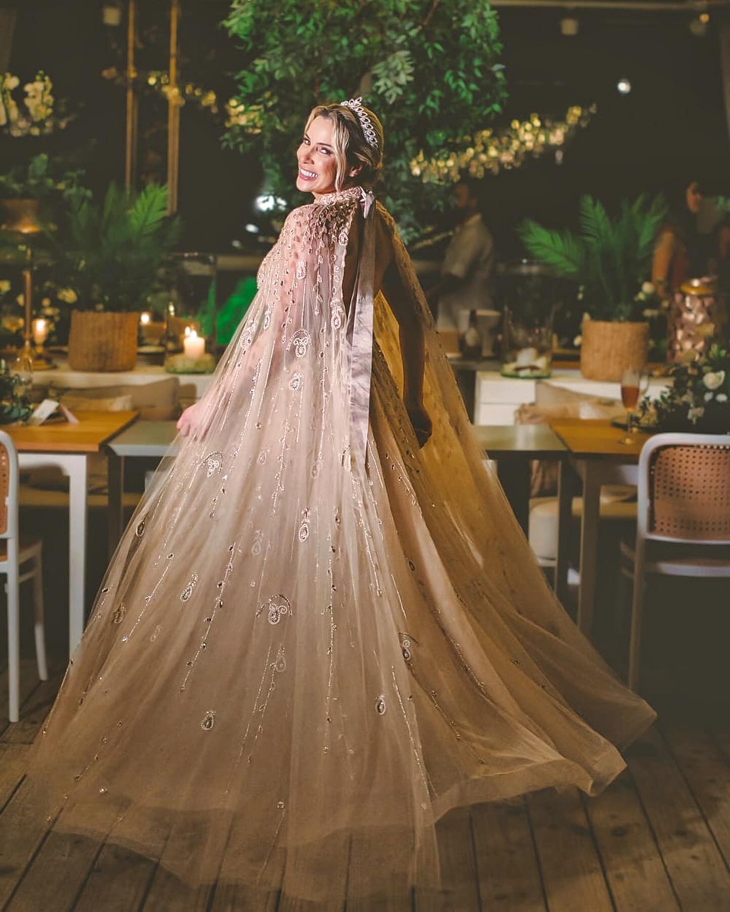 A saia do vestido é longa e fluida, muitas vezes feita de materiais como seda, cetim ou tule, que garantem um caimento perfeito e uma sensação de leveza. A capa flutuante adiciona um elemento de drama ao look, começando nos ombros e caindo em cascata até o chão. Este detalhe não só adiciona volume e presença, mas também traz uma sensação de mistério e sofisticação, transformando o vestido em uma peça única e marcante.