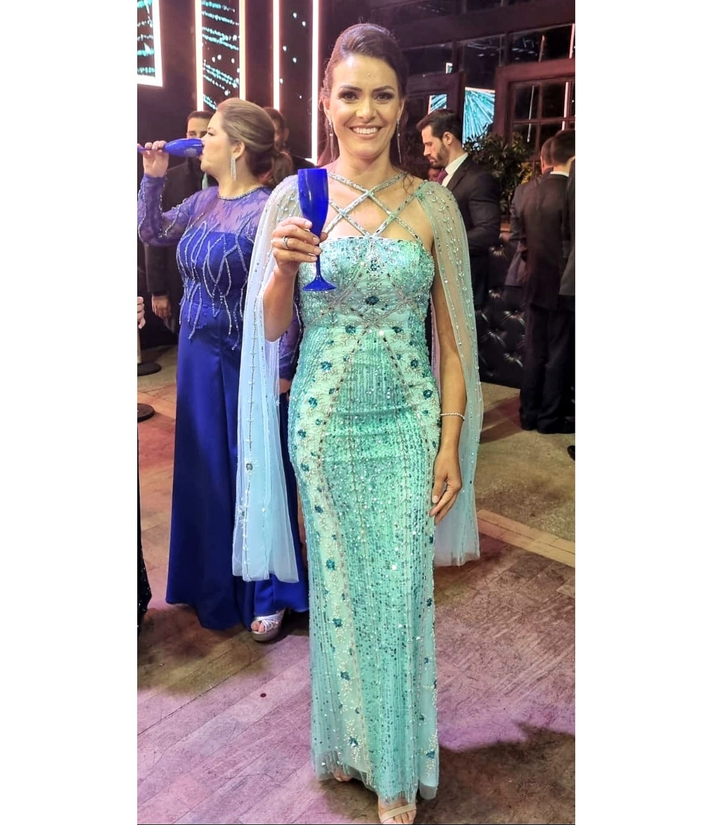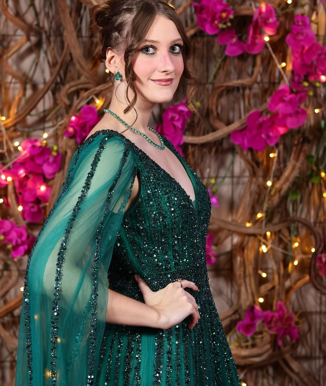 O vestido de festa com capa flutuante longo - Modelo Especial é uma peça de destaque, ideal para ocasiões onde a elegância e o glamour são essenciais. Este vestido combina uma silhueta clássica com o toque moderno de uma capa fluida, criando um visual majestoso e sofisticado.