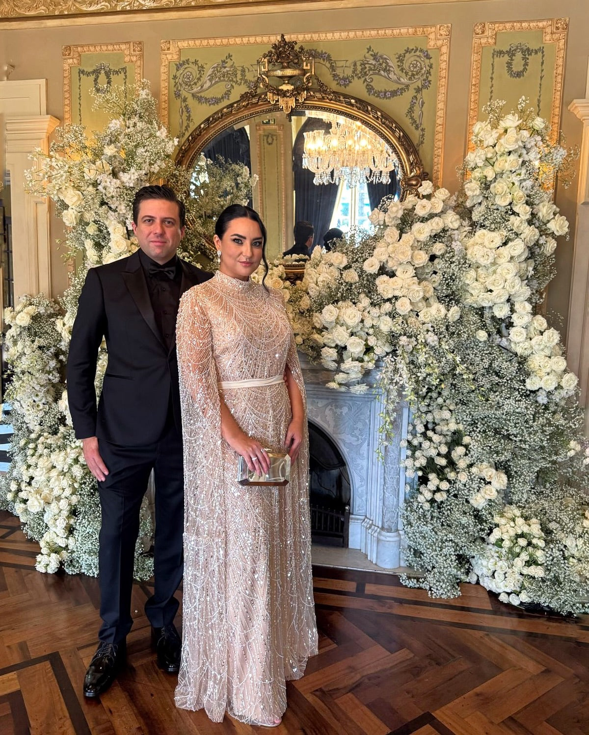 Vestido de Festa Luxuoso com Pérolas e Capa
