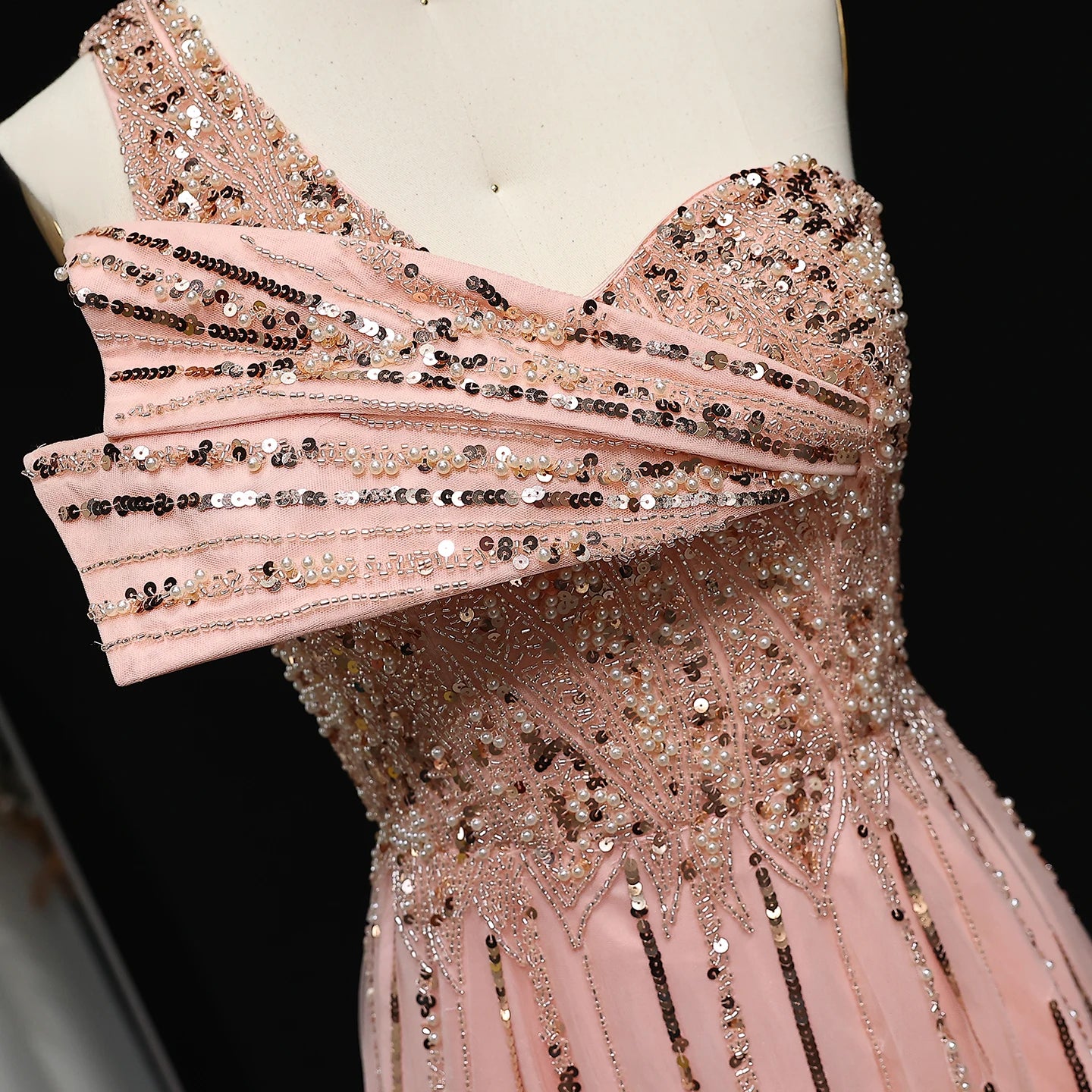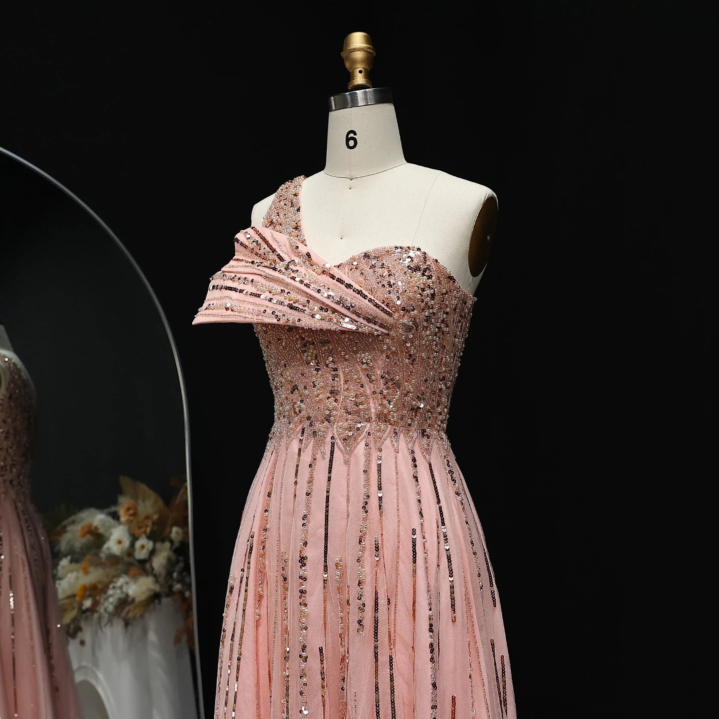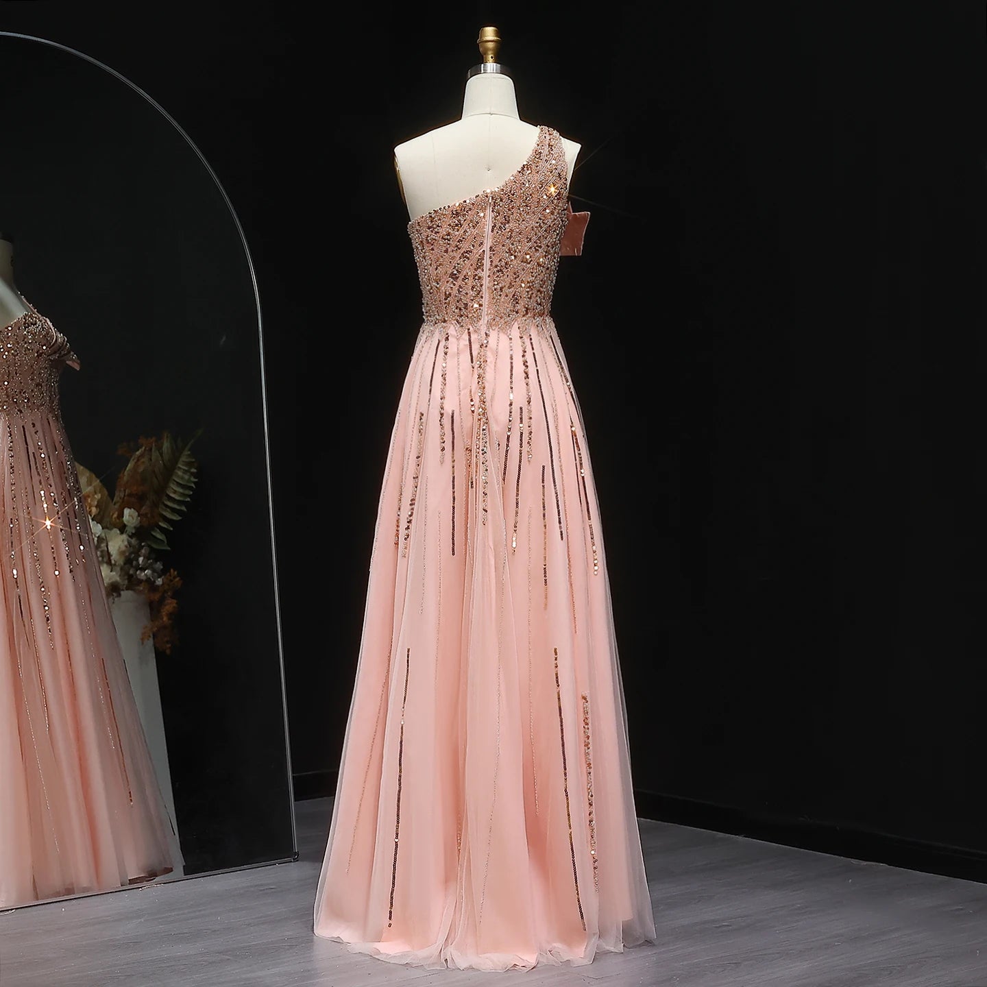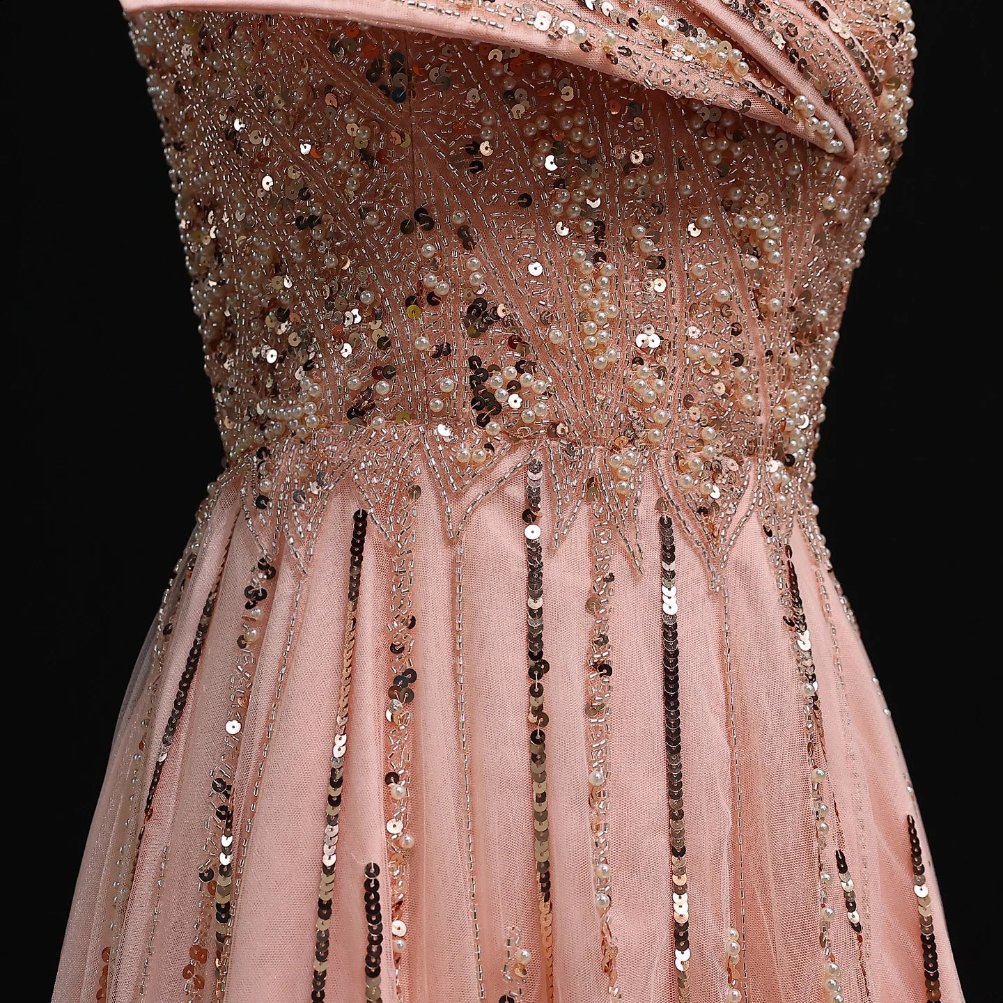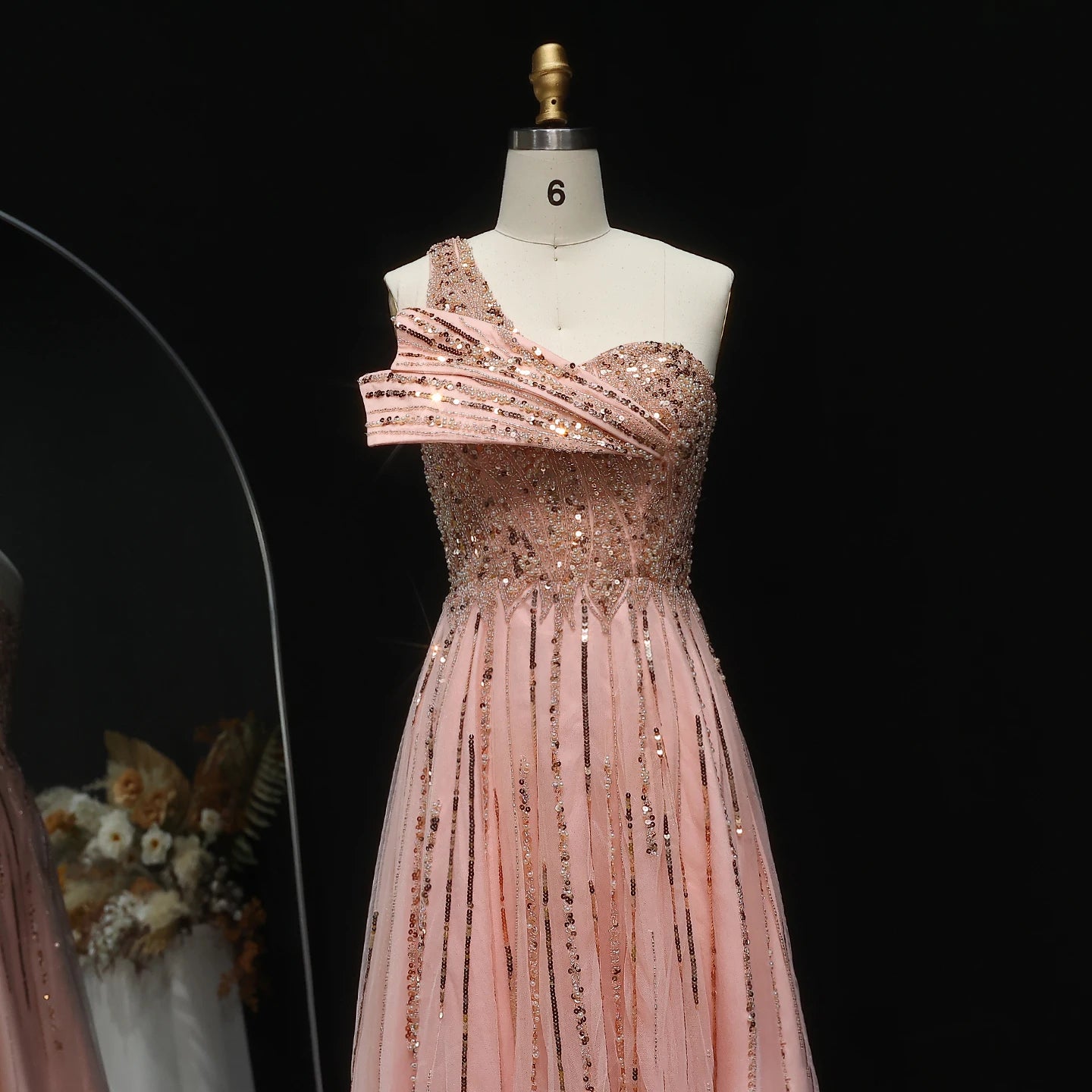 Confeccionado em camadas de tule de seda sobre base em cetim duchesse, o modelo apresenta um corpete assimétrico drapeado, estruturado com barbatanas internas para sustentação perfeita e realce da silhueta. O busto é bordado manualmente com cristais lapidados, lantejoulas finas e fios metálicos, que descem em linhas verticais até a saia, criando um efeito de luz em movimento. A saia ampla e fluida, com caimento vaporoso, oferece elegância natural a cada passo.